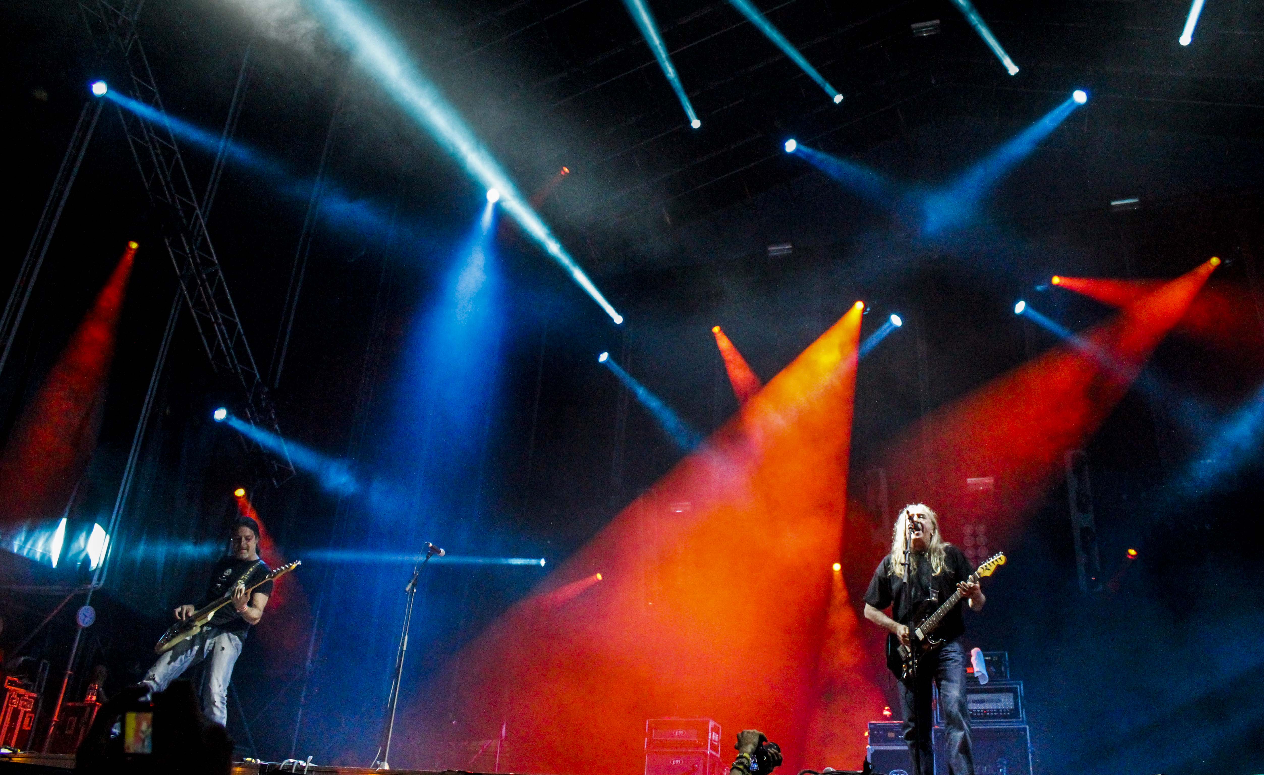 Después de un ritmo de diversión tal alto, la propuesta siguiente era la sobriedad que representa la melena del jefe. Rosendo se presentaba en el Viña Rock de 2014 con la sorpresa de que no había ni un atisbo de nubes por ninguna parte. ¡Se ha roto la maldición de Rosendo con la lluvia! Ya había ganas de verlo en condiciones. Y el respondió pronto a esas ganas. Tendría canciones para hacer tres horas en todo lo alto, pero a sabiendas de que le gusta empezar tranquilo, esta vez la fase ‘introductoria’ fue algo menor es decir, que a partir de ‘Amaina Tempestad’ el tempo de Mariano a la batería subió de revoluciones y ya solo descansó un poco en ‘La Verdad Vencida’ y poco más. Rosendo, con 60 años, ya empieza a reconocer que algún día tendrá que bajarse del escenario, pero no lo hará mientras que vea que funciona y no hace el ridículo… Por pura matemática, queda poco para ese día, pero visto lo visto en el Viña de este año, podemos confiar en un par de giras más. Por cierto, gran frase lanzada al final de la actuación: “Viña Rock, 19 años y hemos estado aquí la mitad. Nos han crecido los dientes aquí y se nos van a caer”. Qué arte. No sé si por falta de tiempo o porque no estaba previsto, terminó contra pronóstico con ‘Navegando’ y no con ‘Maneras De Vivir’, que ya había incluido con naturalidad en el setlist.