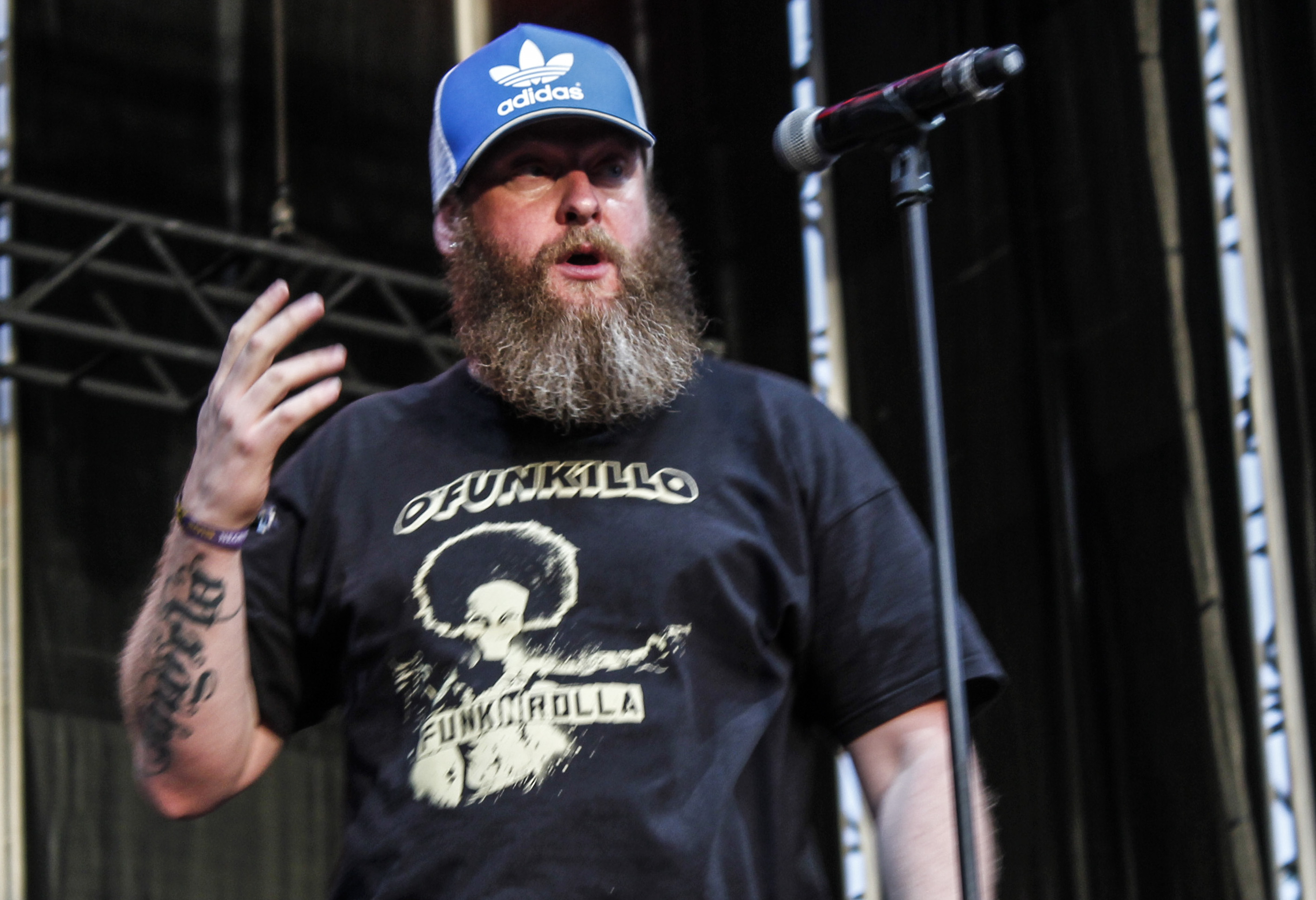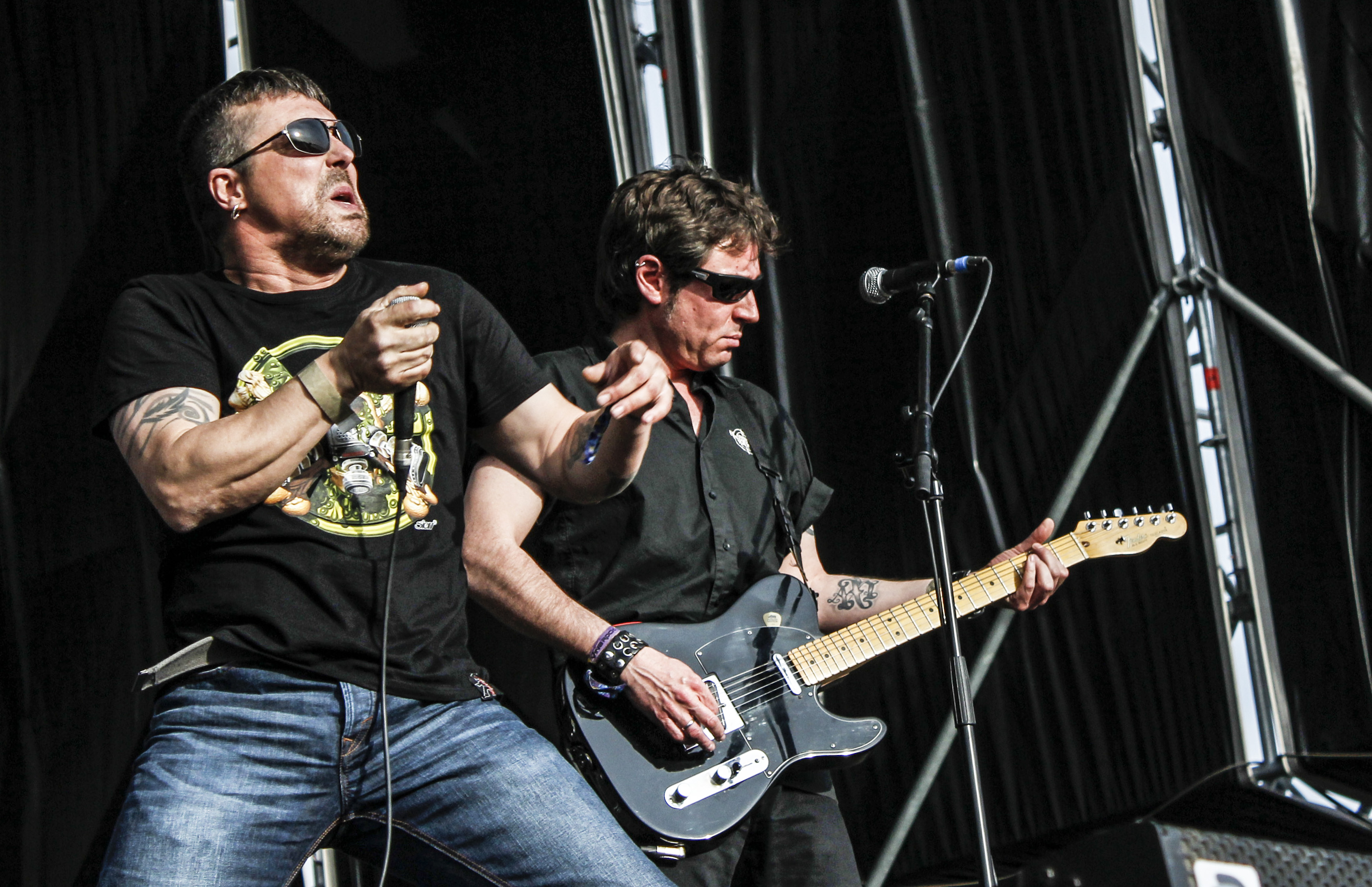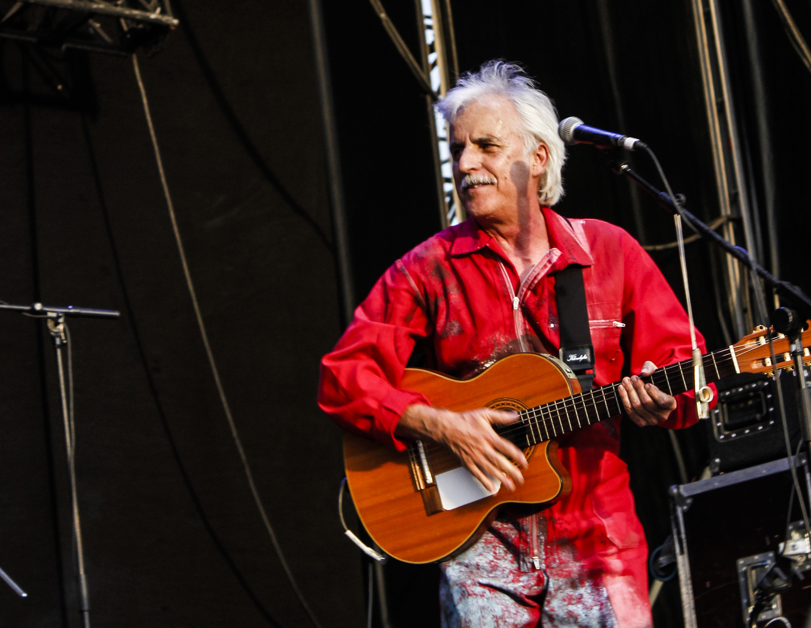 RockSesion El Drogas5Y así llegamos a El Drogas que, lo queramos o no, se nos está haciendo mayor mucho más rápido que otros de su quinta, como Rosendo. El navarro no ha parado de tocar desde que se oficializara su no-regreso a Barricada y quizá va siendo hora de un descanso. Aunque el porte y la imagen, su magnetismo sigue siendo poderoso, creo que el concierto adoleció del ritmo necesario. Que sacar un disco triple para limpiar el repertorio de temas de Barricada es loable, pero se hace duro porque, es evidente, la mayoría de temas no se pueden comparar en grandeza. ‘Barro En La Alpargata’ y ‘Están Para Violarlas’ iniciaron una senda que parecía arder con ‘Bahía de Pasaia’ y ‘0’7’. Los temas de Alzheimer son demasiado lentos para el marco de un festival, con tiempo reducido y grandes espacios, y confieso que no me gusta demasiado la inmediatez textual del Matxinada, así que el concierto siguió con altibajos de ‘Azulejo Frío’ a ‘Peineta y Mantilla’ o ‘La Silla Eléctrica’, reservada para el tramo final. Lo he escrito alguna que otra vez, creo que El Drogas tiene todo para convertirse en otra cosa, en un Tom Waits de nuestro rock, como demuestra cada vez que sienta cátedra sentándose a cantar por sorpresa en cualquier parque. Como los grandes. Pero el juego de gran escenario y recinto se me empieza a hacer cuesta arriba.