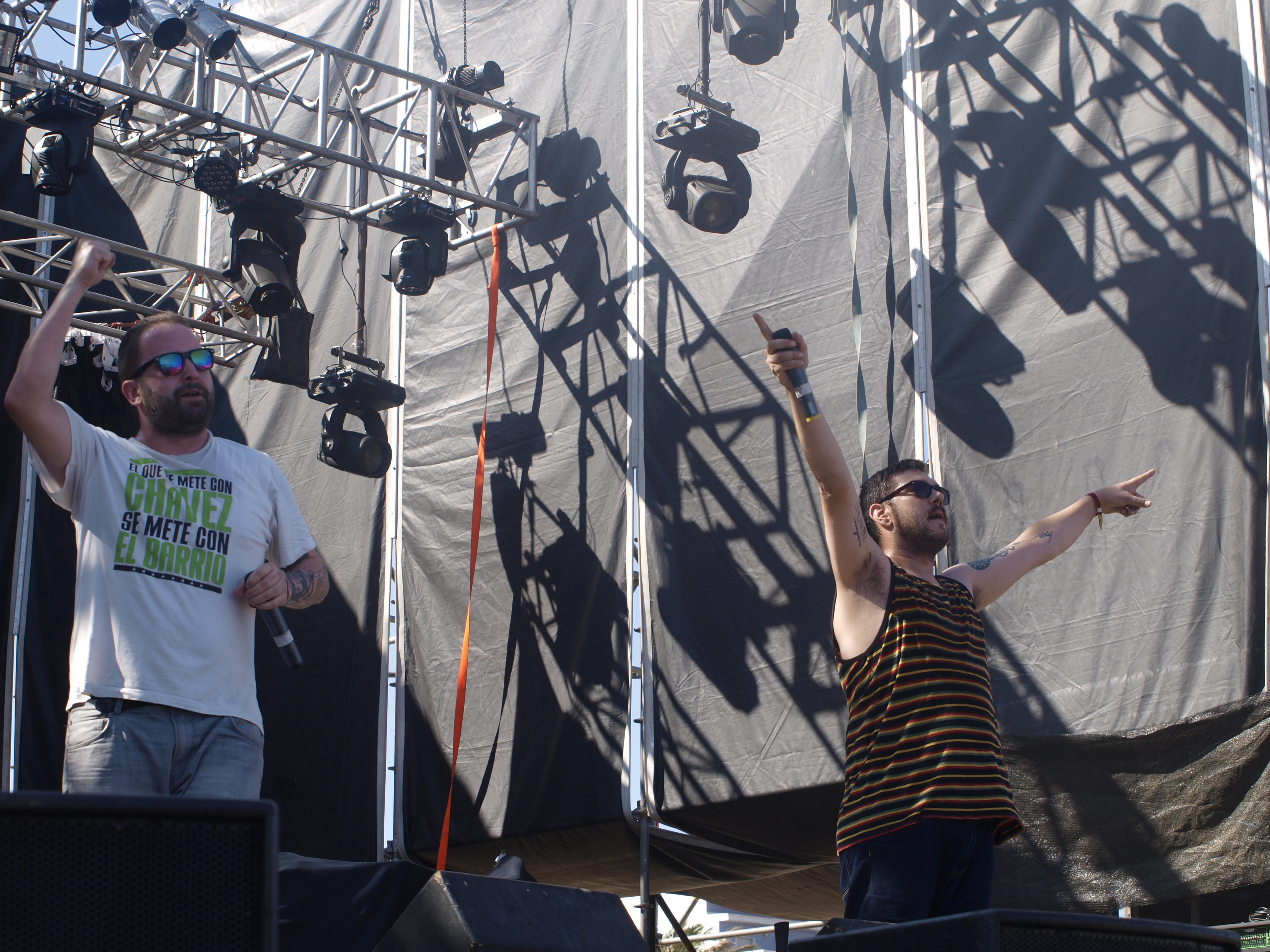 La sesión de tarde la abrió con un calor infernal Los Chikos del Maíz. El trio de Dj Bokah, Toni y Nega ha sabido capear con maestría el éxito popular que supuso su fusión con Habeas Corpus en Riot Propaganda y apenas han perdido ese tirón a tener de los visto en varias citas posteriores. (Algo que quizá sí que le ha pasado a la banda madrileña). En cualquier caso los levantinos sonaron atinados, como siempre lenguaraces en la presentación de cada uno de los temas y con una base rítmica contundente que hacía temblar (literalmente) el suelo más próximo del escenario y también la parte posterior. Una hora que dio para escuchar alguno de los temas más celebrados de la formación, como ‘Putas y Maricones’, el final a salto limpio de ‘COPS’, el pogo generado con Mecano, ‘Paraísos Artificiales’ con “mi mente es un horno”… Repertorio al grano, tanto que entre calores y riesgos de lipotimia se echó en falta ‘Gente VIP’.