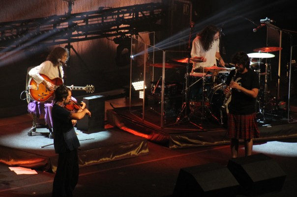 No ha lugar al temor, pero la banda, en su cuarto concierto ante el público tras Valladolid, Pamplona y Valencia, aún no presenta un formato automatizado. Se nota y provoca una sensación de deseo y duda muy poderosa. La tormentosa cadencia de la canción, empieza a anticipar algunas de las constantes de la noche en el sexteto. Lorenzo González en las segundas voces con una pulcritud vocal calcada a la de los discos en estudio. Alber Fuentes en la batería mastica cada una de las canciones con seguridad y con un porte que casi le hace ser el conductor del resto de compañeros. Álvaro Rodríguez se bate con aplicación entre el piano y el hammond, además de saltar la barrera para darle alma al acordeón. Carlitos Pérez, el más joven de la formación, no baja la guardia en la concentración en el violín, sin estridencia alguna, acorde a su estética oriental, con zapatillas japonesas incluidas. En contraposición, David Lerman ejerce de ‘gamberro’ hiperactivo, evidenciado con sus constantes faldas escocesas rojas, así como en el baile, sea con saxo, clarinete o especialmente el bajo en la segunda parte del concierto. Y, finalmente, Robe en un papel de discreción pudorosa para que el protagonista no sea él sino las canciones. Cree en lo que canta y se nota que canta lo que le apetece en este momento. Vibra y siente cada fraseo y se fuerza en cada estribillo aunque, como apuntaba, nada tiene que ver los primeros temas sobre cómo irá evolucionando la velada.