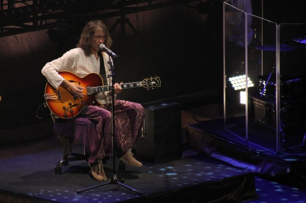 Veinte minutos después arrancaría la segunda parte del espectáculo, que Robe ejecuta en pie, con más brío, quizá más convencional, al estar formado por canciones en las que Lerman demuestra su maestría al bajo. ‘Cartas Desde Gaia’, introducida por Robe con el primer verso de ‘Extremaydura’ que completará el público de manera coral bajo su sonrisa cómplice, es la encargada de prender una mecha de un tramo enérgico y vigorizante. ‘De Manera Urgente’ saca a relucir las reconocidas influencias flamencas del extremeño, mientras que ‘Puta Humanidad’ es celebrada por su concreción más rockera. Todo vuela ya a una velocidad vertiginosa. Ver de pie a Robe, paseando en tramos instrumentales para vivir momentos de complicidad con todos y cada uno de los músicos alegra la vista. También tenerlo más cerca y verle los ojos expresar con miradas las líneas más cargadas de significado de sus canciones. La sensación de paz sigue y llega ‘Del Tiempo Perdido’, ese canto de asunción a la madurez y ese diálogo de violín y clarinete tan de música clásica, con los versos de Manolillo Chinato como presentación.