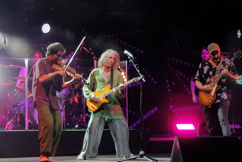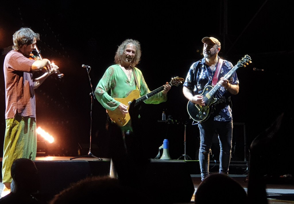 Insisto en repetir que ‘Si Te Vas’ ofrece en esta gira la mejor de sus versiones. La balada canónica de los directos de Extremoduro se hizo más poética con los arreglos de otros instrumentos en la pasada gira de Robe pero es ahora, a la tercera, cuando la canción parece haber encontrado su naturaleza equilibrada gracias a ese diálogo de guitarra y saxo de Woody con Lerman. Con la entrada ‘castiza’ habitual, que presagia más a ‘De Manera Urgente’, afrontaron ‘El Cielo Cambió De Forma’, un tema al que es imposible no acabar rendido cuando el mensaje te da de pleno. Sin llegar a la explosividad furibunda de ‘Poema Sobrecogido’ y ‘De Manera Urgente’, ‘El Cielo Cambió de Forma’ se mueve en esos terrenos, con colores cálidos, pero no agresivos. La derivación aflamencada a la que Robe nunca ha renegado (Lole y Manuel, de nuevo) se muestra ligeramente en un latin-jazz (Bebo) que hermana con las dos mencionadas en su break con violín y las voces de Lorenzo dando el fuego. Es una actitud arrebatada y pasional con ese punto entre la sensualidad y la locura, con cierto halo de teatralidad.
