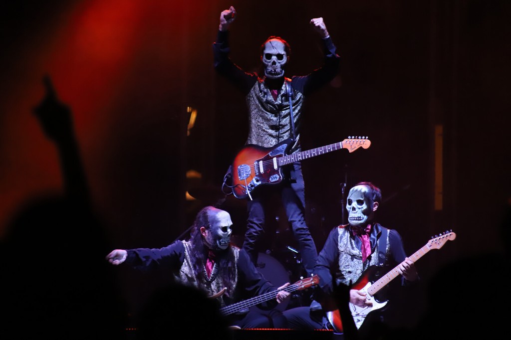 Por el camino, hubo tiempo para hacer una pirámide con el guitarrista sobre las piernas de su homónimo y el bajista, pusieron a un voluntario del público a surfear con una colchoneta hinchable, tras ‘Ni Tu Ni Nadie’ y ‘Wake Me Up’ de Alaska y Wham invitaron a hacer una gigantes ‘La Konga’ y le prendieron fuego antes de los bises al volcán ‘Kilahuea’, además de regalar un centenar de caretas tiki. Plenos honores siempre al mundo tiki, y así siguieron en los bises con ‘Tiki On Me’ (Take On Me de A-Ha), ‘La Chica Ye-Yé’ y el ‘Guitiki’ final.