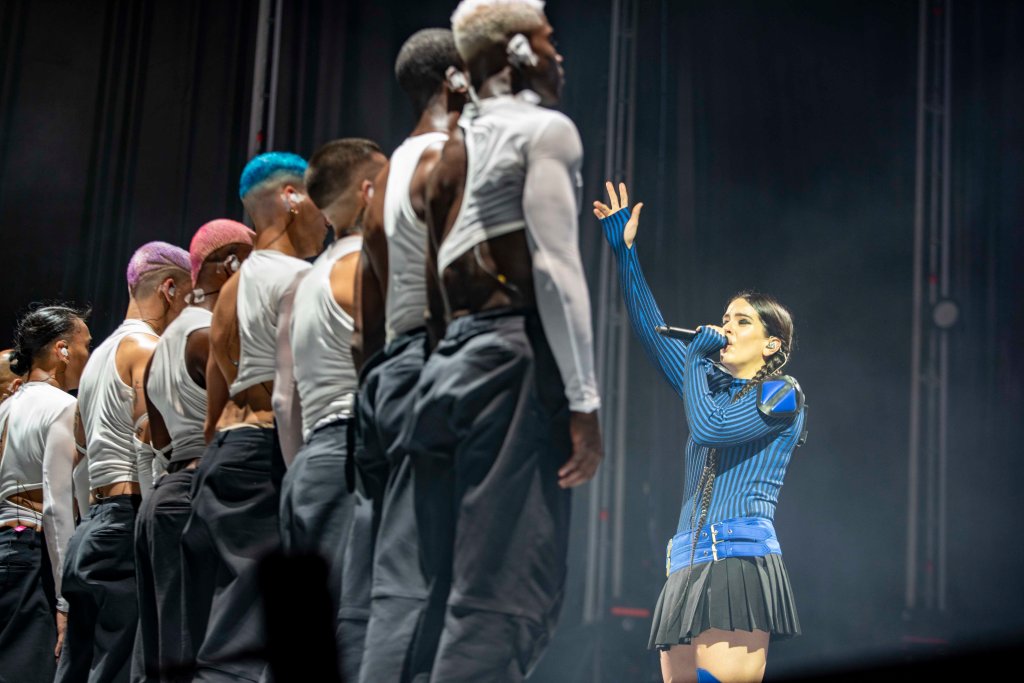 Estos cuatro temas son suficientes para entender el porqué del escenario porque junto a Rosalía y los bailarines (con un premeditado equilibrio que recuerda a los viejos anuncios de Benetton) veremos la figura de un operador de cámara móvil, que retransmite desde el escenario la actuación como si de un videoclip en directo se tratara. Un trabajo de coordinación excepcional que dice también mucho de los nuevos tiempos de la música como espectáculo. Pero, lo más curioso, es que pese a lo que pudiera parecer un maquinal concierto pautado, Rosalía consigue que todo fluya con una naturalidad pasmosa. Que sus improvisaciones y conversaciones con el público prescindan de grandilocuencias, que la sonrisa que brota sea sincera, que el equilibrio entre lo medido y lo improvisado sea arrollador. Y les guste o no a los haters, eso se consigue desde un trabajo de muchas horas al día, desde un compromiso inquebrantable sobre el que se construye, sí, una inversión, pero no por ello regalada.