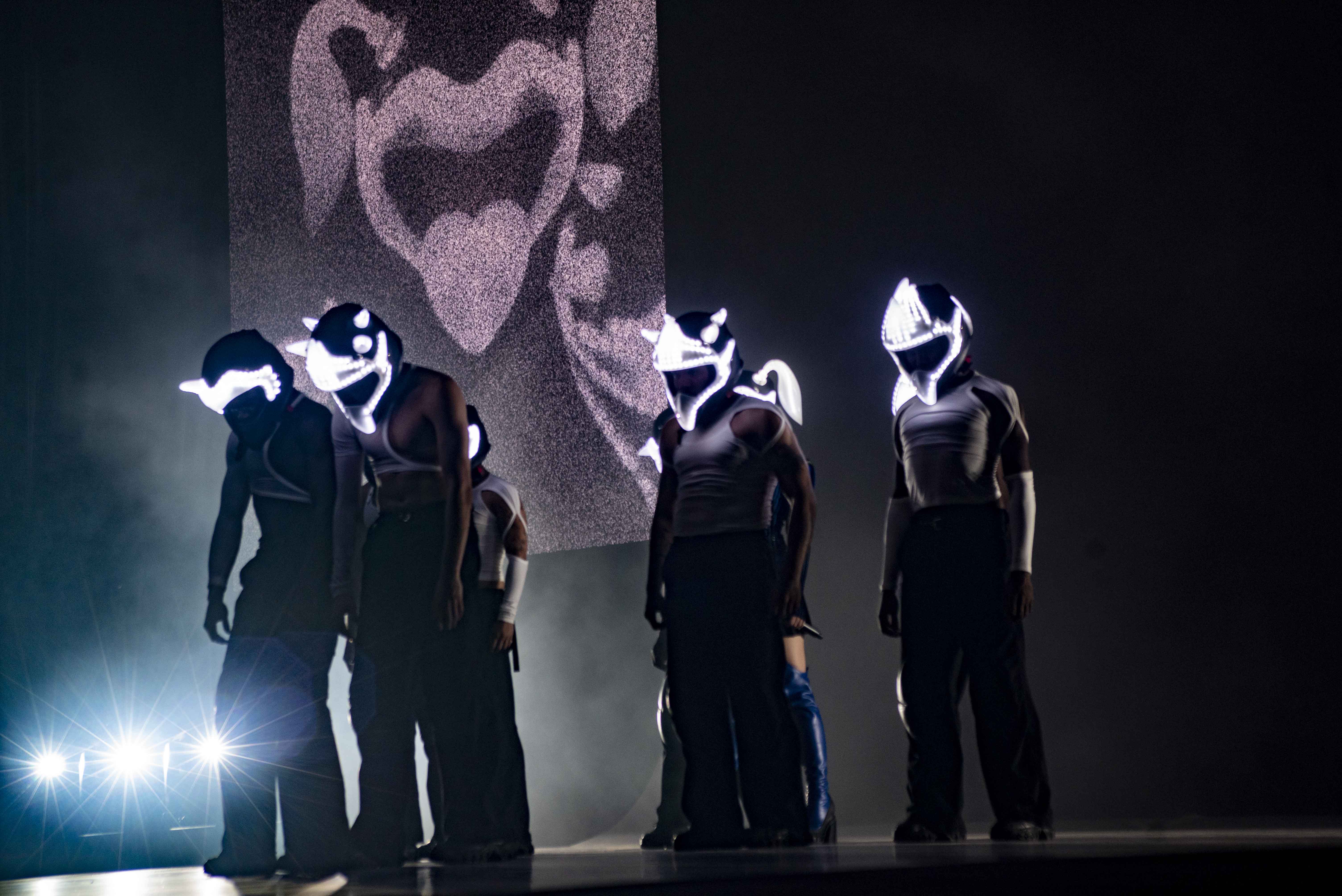 Tras un rugido de motores, el cuerpo de baile de Rosalía, formado por una decena de bailarines, a diferencia de la gira anterior, que eran chicas, aparece ataviado con cascos luminosos y actitud desafiante y guerrera, como si se tratara de un atávico ritual o de la llegada de seres de otro mundo. De entre ellos, cual ‘madre de dragones’ liderando al clan, aparecerá Rosalía con un atuendo colegial que no abandonará en toda la noche, pese a los rigores de la exigencia física del concierto sumado a los calores estivales. ‘Saoko’ inicia el aquelarre de un arranque de canciones que bien podrían haber sido bises. Un tema con una base tan densa como el doom, con un piano desordenado que, sí, bebe del jazz, y que a su vez incluye guiño a Wisin y Daddy Yankee. ‘Candy’, balada romántica de timbre limpio y agudo, con su “Almería no me olvides”, y el jugueteo de ‘Bizcochito’, batidora casi alucinógena donde coquetea con lo infantil puesto que hasta los bailarines recorrían el escenario cual querubines, mantuvieron el efectismo brutal que tuvo su colofón en esos compases y sonidos de bachata canónica que es ‘La Fama’, con base del joven Tainy.