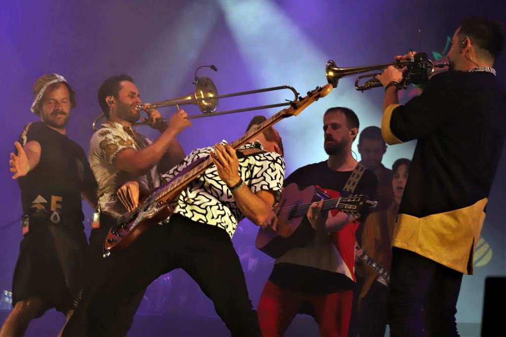 Con su nuevo disco publicado hace apenas tres meses, La Pegatina volvía a The Juergas con hechuras de ser considerado como el cabeza de cartel en todos los sentidos. Quizá por la cercanía y por la asunción de galones, no cargaron demasiado las tintas en ello y apenas ‘Nothing But A Lie’ o ‘Corea Del Sur’ sonaron en una actuación que, en cualquier caso, fue de menos a más de manera muy patente. ‘Como Se Hacen Las Flores’ y ‘Mama’ sonaron en el arranque antes del primer giro de tuerca con ‘Y Volar’. Pero como todo el mundo sabe, es en los popurrís y remezclas concatenadas donde la banda de Adrià Salas, Rubén Sierra y compañía se hace grande, sobre todo cuando además regalan piezas populares como las ‘Corazón Espinado’ o ‘Let’s Get Loud’ que sucedieron a ‘Contando Lunares’. No hubo que esperar demasiado para el siguiente, con ‘Despierto’, ‘La Vida Es Un Carnaval’, ‘Muérdeme’ y la añeja ‘Tomasín’. Luz, color, algarabía y una noche entrando en plenitud con la rumba catalana y festiva de una banda que no da concesión a la nostalgia. La también novel ‘Yo Quiero Bailar’ abría la traca final hacia una progresión final azuzada con la veloz ‘No Som D’aquí’ y continuada con un alocado medley con ‘Mi Gran Noche’ incluida. Quedaban los bises esperados, con ‘Maricarmen’, con ese videoclip grabado en la localidad almeriense de Fiñana, y ‘Lloverá y yo veré’ que concluyó con el habitual estallido de serpentinas y aderezos festivos. La Pegatina va a piñón fijo y su concierto siempre cumple las expectativas de los suyos.