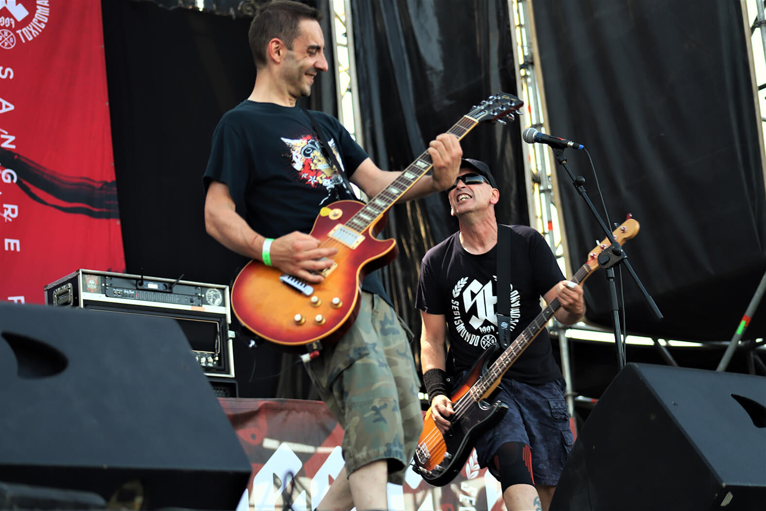 Muchos recuerdos los que evoca Desakato que volvía a un festival donde ha firmado varias de las páginas más épicas de su historia. Tanto como un épico año (el segundo) en el que tocaron apenas 30 minutos después de entrar con la furgoneta desde Asturias, llegando casi sobre la bocina, hasta algunas imágenes icónicas tanto en polvareda como con manguera mediante (algunas las podéis ver en las crónicas de dichas ediciones en la web). Además de eso, Desakato fue la primera banda en España que se lio la manta a la cabeza para realizar un concierto en streaming de pago, con una producción cuidada, con el objetivo de ayudar y mover a todo el equipo que les acompaña y que realiza el trabajo que no se ve delante de los focos. Pagamos entrada y os contamos también aquí aquel concierto. Con todos estos ingredientes, confirmamos que el tiempo parece no haber pasado por el grupo, que sigue destilando energía, contundencia, melodía y arreglos que les hace ser diferentes al tipo medio de nuestra escena. Abrieron con ‘Volcán’ y pronto golpearían fuerte con ‘Octubres Rotos’ y ‘La Ira de los Hambrientos’ tras la que vendrían otras celebradas como ‘Nuestro Legado’, ‘Tiempo De Cobardes’, ‘La Cura o ‘Sombras’. La puesta en escena de Desakato ha ganado personalidad con la colocación de la batería a un lateral y delante, como un músico más, como también con el progresivo aumento de PA’s propios que les va a acercando progresivamente a esa muralla de S.A. de la que hablamos siempre. Un Nano, por cierto, que me fue muy elogiado por parte de Tripi, baterista de Evaristo. Acierta el grupo en adelantar la presencia de ‘Cada Vez’ ya que todavía quedaría mucho que cortar hasta el final, aumentando pulsaciones con el trallazo de un minuto de ‘Carta De Un Paria’, con ‘Fueu y Solombres’ o ‘La Tormenta’, siempre épica. Para cerrar, ‘Pánico En Frankfurt’ y ‘Cuando Salga El Sol’ para terminar de rendir a The Juergas una vez más a sus pies.