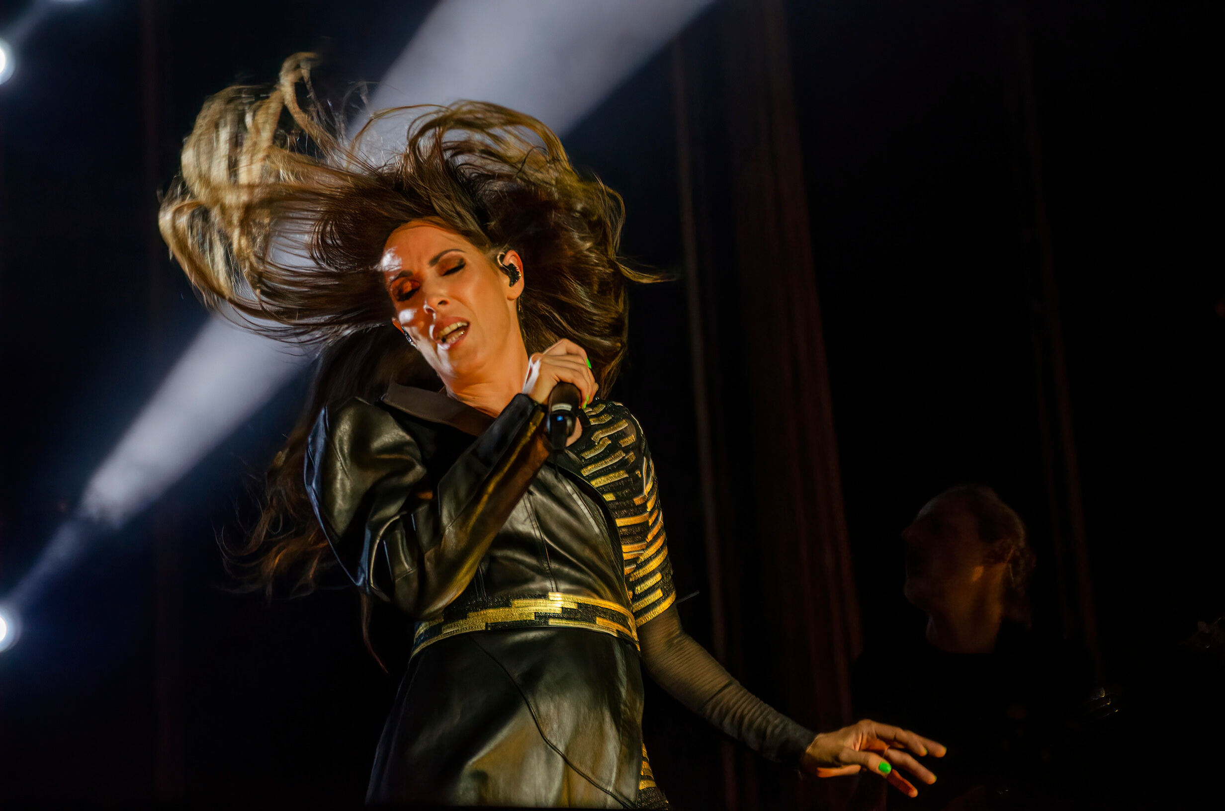 Se abrió con ‘Ingobernable’ un espectáculo de dos horas. En escena con una suerte de capa al más puro estilo superhéroes y manejando como quien respira el juego capilar de ventilador, pronto el público se daría cuenta de que todo estaba al servicio de dejarse llevar por todo lo que ocurría en el escenario. Una banda rodada y engrasada a la perfección, con Paco Beneyto a la batería, Yago Salorio al bajo, José de Lucía a la guitarra española y acústica, Charlie Calzada a la guitarra, Yaiza García en los coros, Jessica Estévez y Míriam Moreno como multiintrumentistas (de trombón a saxo, pasando por dobles percusiones, panderetas, flauta travesera, etc), Julián Olivares a la guitarra y Rubén García al piano y dirección musical.