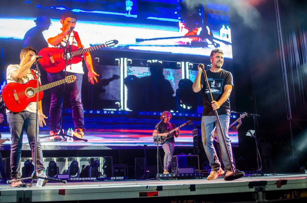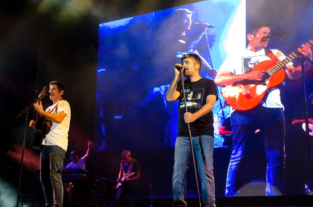 Tras ‘Tu calorro’, continuó la fiesta con el ritmo de ‘Vino tinto’ y en la tercera canción presentaron ‘Fuego’, que como otras letras habla de la pasión y amor en la pareja. Son estrofas festivas, tamizadas con el sentido de humor que caracteriza a los hermanos Muñoz, y también algunas con una aguda crítica social, que conectan de inmediato con el público y son tarareadas ya sean en el concierto o en las celebraciones con amigos. A estas alturas el público estaba en todo lo alto, por lo que Jose y David decidieron bajar el biorritmo, si es posible en sus conciertos, para coger aire con ‘Tragicomedia’, para volver a la carga con los sonidos de guitarras con ‘Vacaciones’.