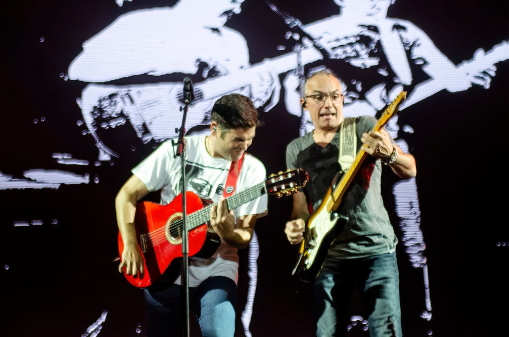 Con ‘Me falta el aliento’, ‘Fuente de energía’ y ‘Paseo’ concluyó la noche a falta de los bises. Aunque más bien habría que decir que finalizó el primero de los dos conciertos que ofrecieron. Pues mientras las primeras veinte canciones las interpretaron al ritmo de la guitarra, o como dice la canción “A toda pastilla”, los extensos bises los dedicaron a ofrecer un acústico, un concierto íntimo. Sentados en taburetes, y con sendas guitarras españolas, cantaron versiones reposadas de ‘Escucha princesa’, ‘Dominios’, ‘Rumba triste’ y ‘Mi primera cana’, dedicada al maestro Sabina.