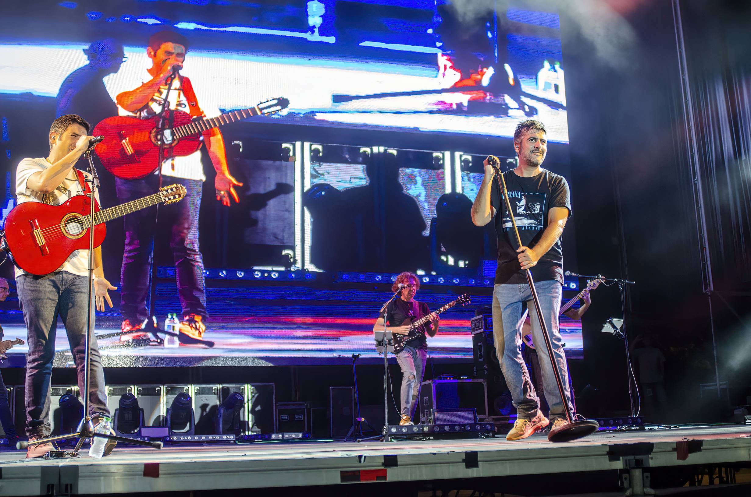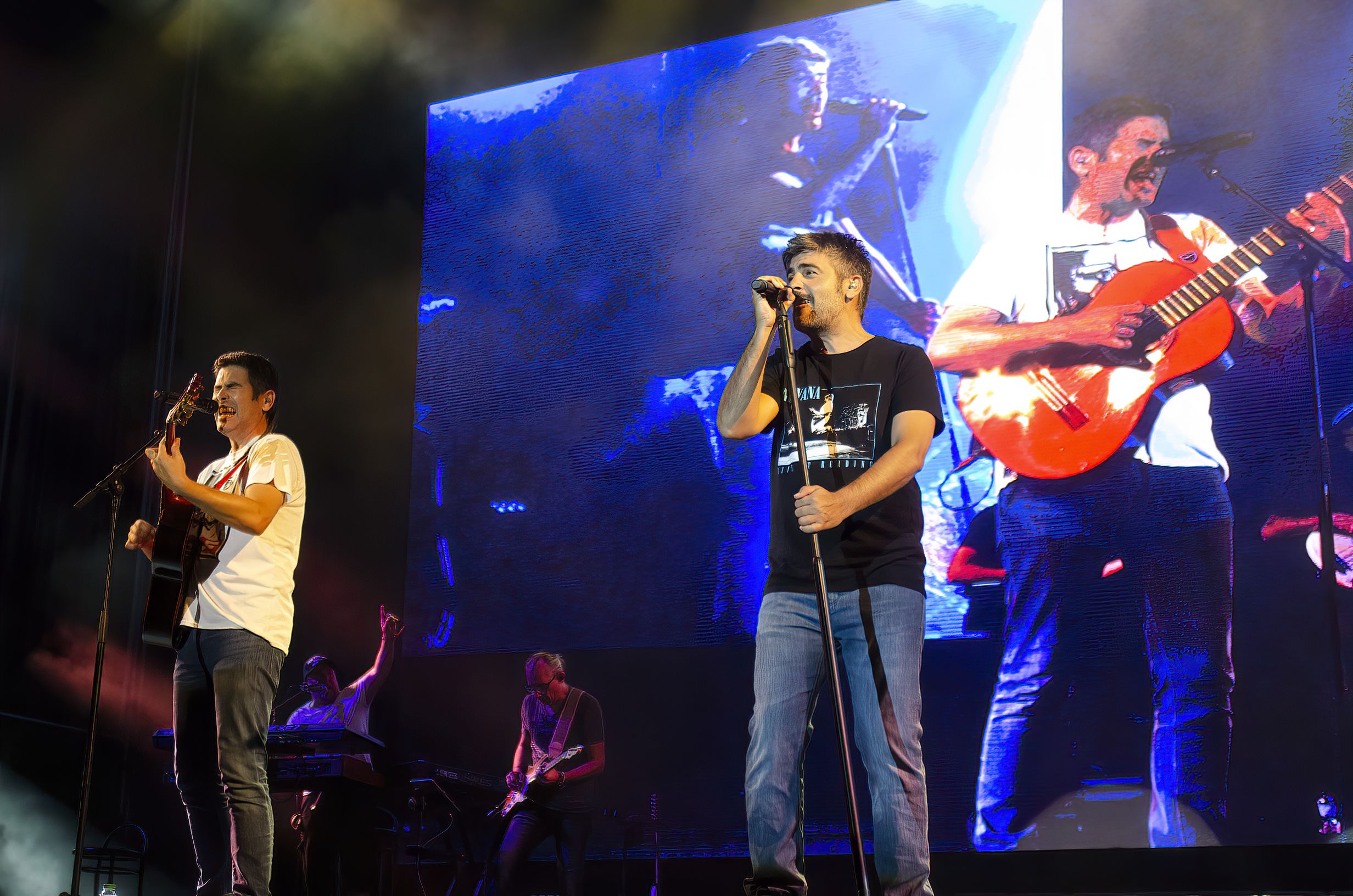 Tras ‘Tu calorro’, continuó la fiesta con el ritmo de ‘Vino tinto’ y en la tercera canción presentaron ‘Fuego’, que como otras letras habla de la pasión y amor en la pareja. Son estrofas festivas, tamizadas con el sentido de humor que caracteriza a los hermanos Muñoz, y también algunas con una aguda crítica social, que conectan de inmediato con el público y son tarareadas ya sean en el concierto o en las celebraciones con amigos. A estas alturas el público estaba en todo lo alto, por lo que Jose y David decidieron bajar el biorritmo, si es posible en sus conciertos, para coger aire con ‘Tragicomedia’, para volver a la carga con los sonidos de guitarras con ‘Vacaciones’.