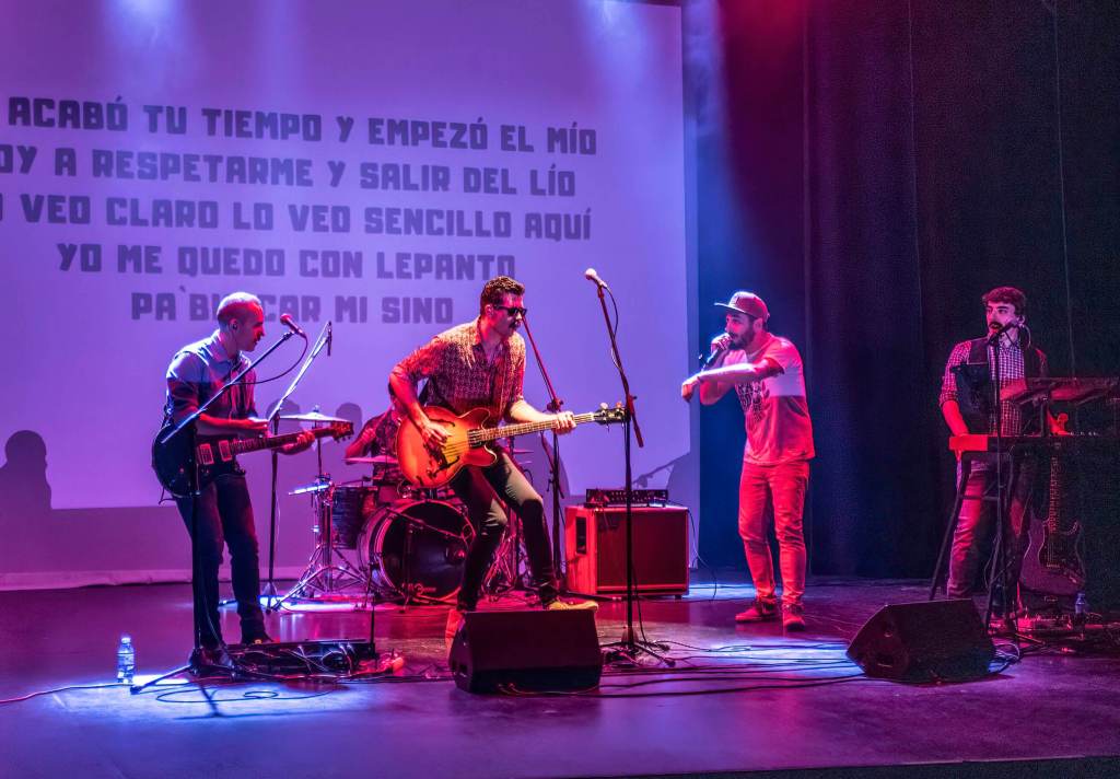 “Esta noche venimos con todo, y cuando decimos con todo, es con todo”. Con esta declaración de intenciones que deja poco lugar a dudas se presentaba anoche en el Teatro Apolo Manuel Carmona, el líder de su nueva banda Lepanto, con la que presentaba en Almería su último trabajo discográfico, el epé titulado ‘El Duelo’. La cita, en el marco de la programación de otoño del Área de Cultura y Educación del Ayuntamiento de Almería, en la línea de trabajo de apoyo a los creadores almerienses, contó con todo a favor para ser una noche que sin duda quedará para el recuerdo. Una banda de excepción, completada por Pepe Atienza a las guitarras y teclados, Ángel Peñalver en la guitarra y Borja Tijeras en la batería y una serie de colaboraciones de otros músicos reconocidos de la escena local, como el rapero (y baterista) Rofo Lôquemor y los vocalistas Juan Diego Fumangie y JJ Fuentes.