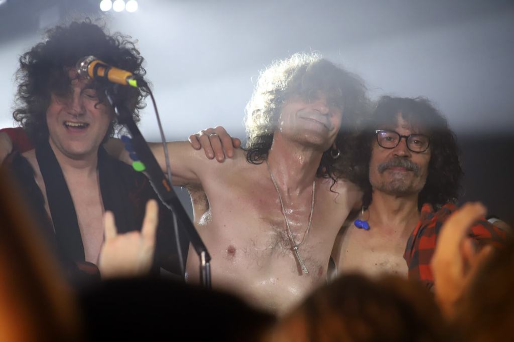 Hay, está claro, temas y temas. Y es en los blues más canónicos, como el gran “¿Cómo Has Perdido Tú?” de Platero donde Iñaki sí se muestra solvente y confiado en las nuevas tareas. Porque de las guitarras para qué hablar. Hasta cinco distintas sacó a pasear anoche, entre Fender clásica, Stratocaster y o las Sabrafen, especialmente destacable la SG de cuerpo hueco de nuez. “Una Vez Más” sonó con el toque de vacile apropiado, con esa aura tan Status Quo. Para cerrar el primer bloque, llegaría una sorpresiva “Salir”, colocada muy arriba en la distribución. Y es que, por más que puedan criticar algunos, lo cierto es que de veintitantos temas solos seis fueron de Extremoduro que se celebraron con algarabía, sí, pero no mucho más que los grandes clásicos de Platero. Es decir, tengo la impresión estrictamente personal que no tardarán en salir de la lista en cuanto los Uoho tengan temas propios rodados con este nuevo formato.