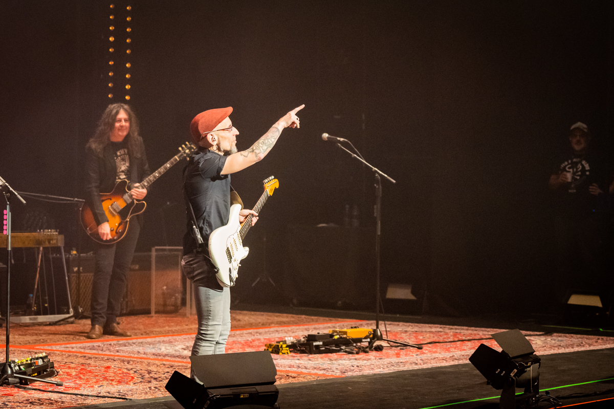 “Catorce Vidas Son Dos Gatos” es el momento más raquítico de la noche, interpretado con sobriedad y con pocos artificios, con mención especial para el pedal Steel de Raya. Ejerce de nexo a lo que Fito vino a denominar «la parte gypsy», con los siete músicos reunidos en las alfombras. Para dicho tramo, abrirían con “Me Quedo Aquí”, un tema de Fetén Fetén que ya contó en su versión de estudio con la colaboración de Fito, que aseguraba que «es la mejor canción que he cantado en mi puta vida». Estemos o no de acuerdo, sirvió para sumergir en la atmósfera pretendida, con la continuidad de las añejas “Ojos De Serpiente”, entre la que insertó “Yo No Soy Bo Diddley”, y “El Funeral”, donde además del fantasmagórico sonido del serrucho y arco de violín de Diego, contó con un divertido momento de acordeón con Jorge, rematado con una de las danzas húngaras de Brahms, tan popularizada por Mägo de Oz.