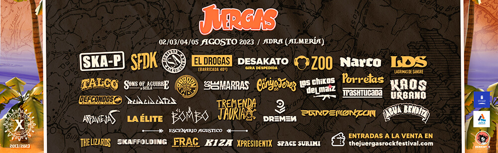 Transición y efectos pandémicos superados con éxito. Ese es el feliz titular que nos dejó la novena edición de The Juergas Rock Festival, celebrada el mes de agosto del pasado 2022. Y no era fácil vaticinarlo porque la incertidumbre era grande. El cambio de propiedad en la última edición antes de los dos siguientes años complicados por la pandemia hacían, de alguna manera, entrever que The Juergas Rock ‘se la jugaba’ en la edición de 2022 y para triunfo de público, bandas, organización, patrocinadores y medios de comunicación, el resultado fue excepcional. Qué mejor base que esa para preparar, nada más y nada menos, que un décimo aniversario como el que se desarrollará los días 2, 3, 4 y 5 de agosto en la localidad costera almeriense de Adra. Una cita que vuelve además con el impulso de recuperación de viejas costumbres ‘sacrificadas’ en aras de aliviar costes, como es tanto el escenario Agustico como la fiesta de bienvenida. A falta de concretar los nombres de dicha velada, hoy se ha desvelado el cierre del cartel, con otros quince nombres propios entre los que destacan S.A., Talco, Los De Marras, El Canijo De Jerez, Los Chikos Del Maíz, Porretas, Kaos Urbano y con especial agrado la inclusión de los emergentes La Élite y el local El Bombo. RockSesión volverá a estar un año más cubriendo un festival que hemos tenido la suerte de ver crecer cada año, en el que incluso hemos trabajado durante un par de ediciones haciendo entrevistas. Como es tradición también, os completo la playlist recomendada para ir calentando el ambiente de aquí a agosto, que actualizaremos con la fiesta de bienvenida junto con los horarios. Está organizada con una canción por banda en el primer bloque y, a continuación, bloques de cuatro temas de cada una de ellas. Nos vemos en Adra. Quien quiera que le firme allí mi libro de Poesía Básica. Extrechinato y Tú ensancha el alma, ¡que avise!