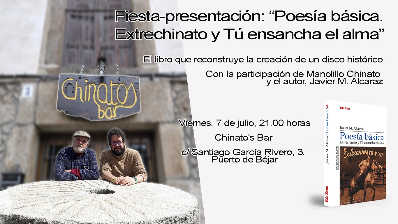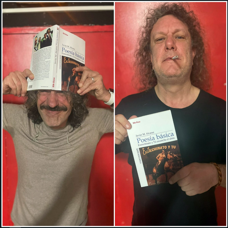Hoy el álbum de fotos que estamos creando a raíz de la publicación del libro Poesía básica. Extrechinato y Tú ensancha el alma recibe con todos los honores a uno de sus cuatro protagonistas fundamentales: Iñaki Antón, ‘Uoho’. Como hicieran Chinato, Fito y Robe, el guitarrista se ofreció desde el primer momento a colaborar con sus testimonios y recuerdos para ayudarme a seguir ensamblando piezas de esta historia y, junto al gran José Ignacio Cantera, baterista de varios temas de Poesía Básica (en otro tocará su hermano, Ricardo, y en otros cuantos Jesús García, de Platero y Tú) no han dudado en posar con la obra. Aquí de manera ‘formalita’, dentro del artículo os dejo otra más gamberra. Pura diversión. Iñaki me atendió ‘a deshora’, como quien dice, a trasnoche, dado que era una época en la que estuvo centrado en los cuidados a su madre. Puro corazón. Costó tirar pero al final pasamos un buen rato y se emocionó al revivir la historia. «Desde el primer momento que recopilamos ideas, teníamos claro que Extrechinato y Tú no tuviera que ver con nada. Lo concebimos desde el principio con total libertad, con cualquier tipo de música, sin estilo, totalmente abierto y creativo». Y deja claro su cariño hacia Manolo: «Es una factoría de recuerdos. Para Manolo lo que sea, es mi hermano, lo que sea». Iñaki y Cantera se unen así a la familia de fotos donde ya figuraban Manolillo Chinato, Fito, Marea, Poncho K, Rulo, Estopa, Charlie Sánchez, Tuco y Óscar Beorlegui. Habrá más. Recordad que el libro lo tenéis en librerías (si no lo tienen lo piden y llega en pocos días) y también en la tienda de Efe Eme, en Amazon, en La Esquina del Zorro, en Fnac, El Corte Inglés, La Casa del Libro… Y también que tenemos inminentes nuevas citas de la agenda de actos y presentaciones (os dejo cartel dentro). Viernes, 2 de junio. Presentación en librería La Esquina del Zorro (con Rubén G. Herrera). Madrid / Domingo, 4 de junio. Firma de ejemplares en la Feria del Libro de Madrid. Librería Altamarea. (Stand 63). / Viernes, 7 de julio. Fiesta presentación con Manolo Chinato. Chinato’s Bar (Puerto de Béjar). / Sábado, 8 de julio. Coloquio y firma de ejemplares. Librería El Jardín Secreto. Plasencia.