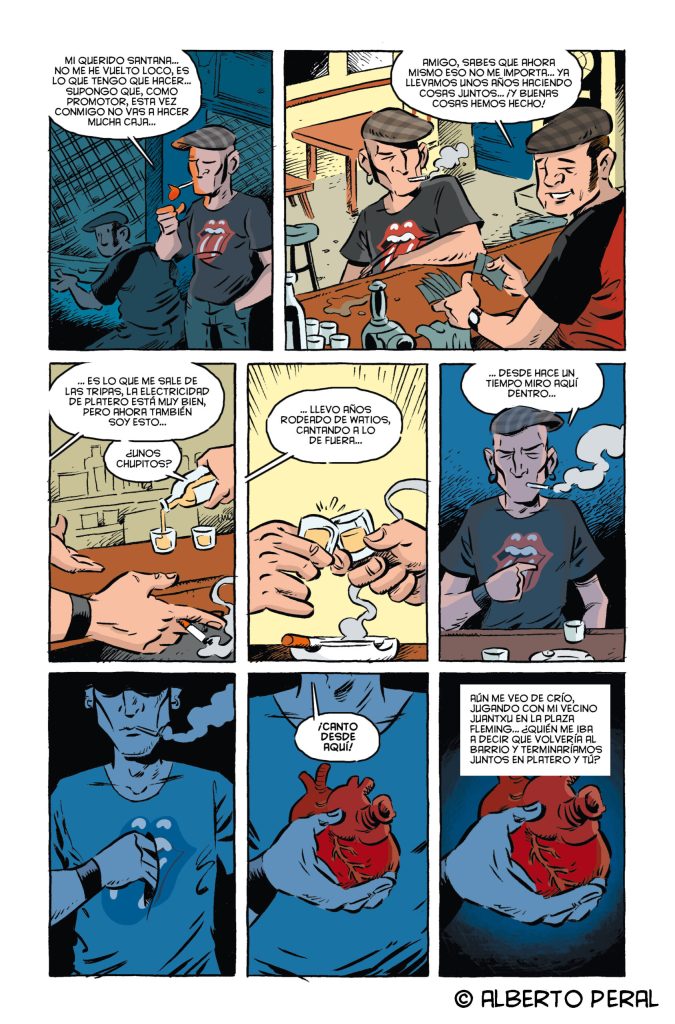 Desde los sueños de radiocasete y escuchas iniciáticas de la niñez (bien regadas de música, que casi parecen sonar de verdad en nuestra cabeza durante la lectura y que de forma inteligente los Kikes han plasmado en una playlist Spotify –adjuntada al final-), los primeros trabajos, su ‘nomadismo’ hacia Cantabria, Málaga, la mili, el Palanca… Salvo alguna que otra licencia para variar la linealidad, el desarrollo es cronológico y es encantador ver ilustrados esos comienzos de Platero y Tú, cómo se hace referencia a los primeros encuentros con Extremoduro, la posterior gira conjunta, el disco con Extrechinato y Tú (curioso para mí sentirme algo ‘partícipe’ por haber profundizado tanto en ello), la apuesta definitiva por Fitipaldis (se pasa de puntillas por la ruptura, eso sí) y el crecimiento honesto desde las salas para 30 o 40 personas hasta llenar San Mamés y el Royal Albert Hall de Londres.