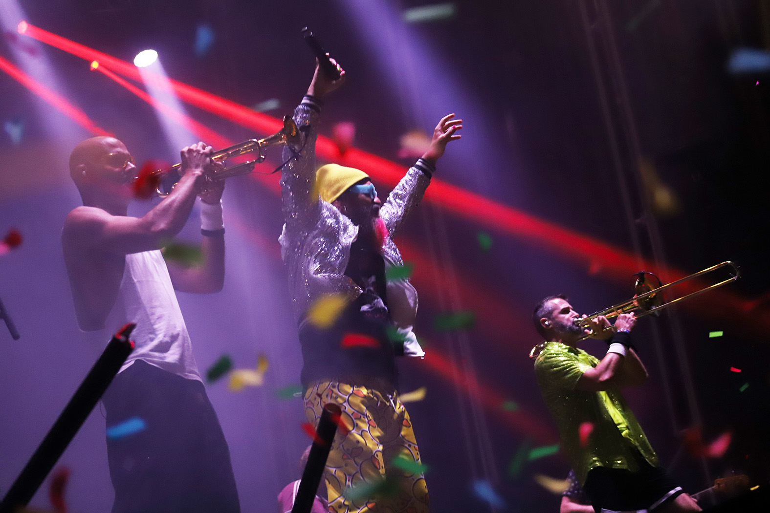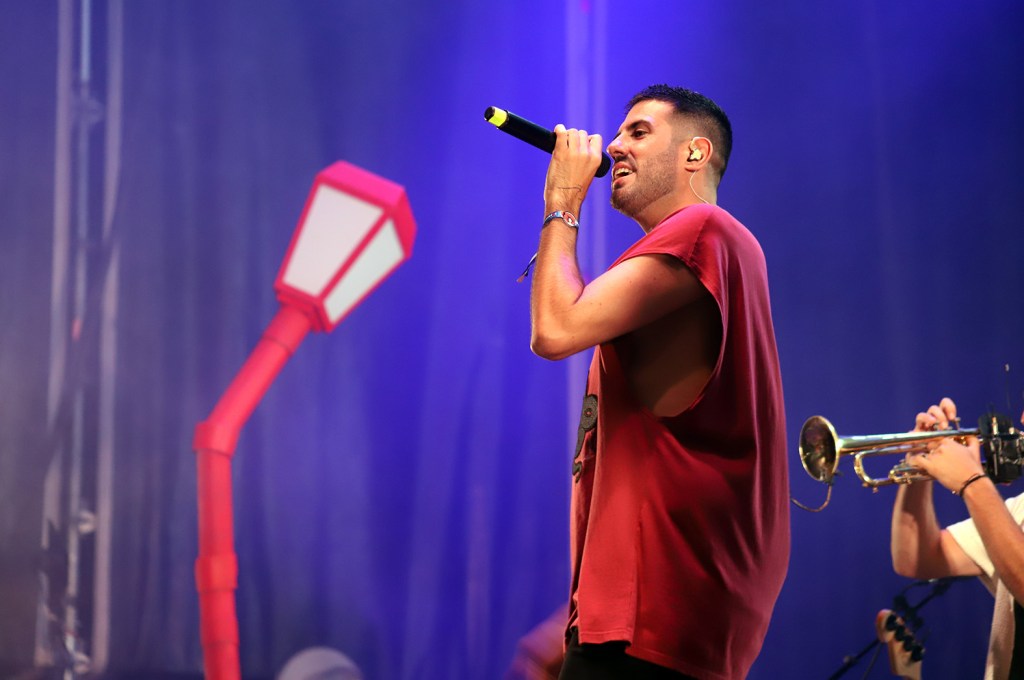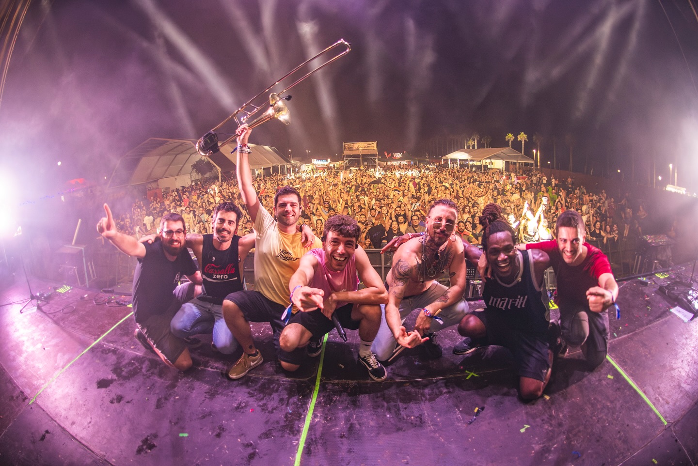 Si el año pasado el cénit de público en la fiesta de bienvenida lo alcanzó SFDK (más que Reincidentes, incluso), en esta edición estaba claro que lo haría La Pegatina, otra banda que repetía visita tras cinco o seis ediciones. Lo hicieron con ese halo de “posible última vez” que deja cualquier gira de parón indefinido y aunque el repertorio no es que haya tenido demasiadas concesiones a bajar el ritmo se hizo más patente si cabe que el soniquete festivo iba a ser una constante. Con una escenografía propia sin grandes alardes pero sí muy currada, tanto en pantallas como en atrezzo y los sempiternos papelillos y serpentinas la colorista música de La Pegatina empezó con “Y Volar” o “Non è Facile” para sacar pronto a relucir la decena de referencias a otras bandas que se cuelan a lo largo de toda la actuación, desde “La Guitarra” de los Auténticos Decadentes”, pasando por el remix rumbero capitaneado por el “Ni Más, Ni Menos De Los Chichos”. Fue poco después de “Candela” y “¿Cómo Explicarte?” cuando Adrià Salas salió al paso de algunos gritos entre el público. «¡Eh! No vengáis a jodernos la fiesta a decir cosas que yo no he dicho. ¡Viva Palestina libre!», apuntó al paso de las críticas que la banda ha recibido siempre por actuar en la fiesta de Eurovisión en Israel hace unos años. Con más guiños y más soniquete ska-rumba todavía quedaría más guiños (“Yo quiero bailar”, “La Mordidita” y un largo etcétera) sin olvidar su remix “Miranda”, “No Som D’Aquí”, “Mari Carmen” y “Lloverá y Yo Veré”.