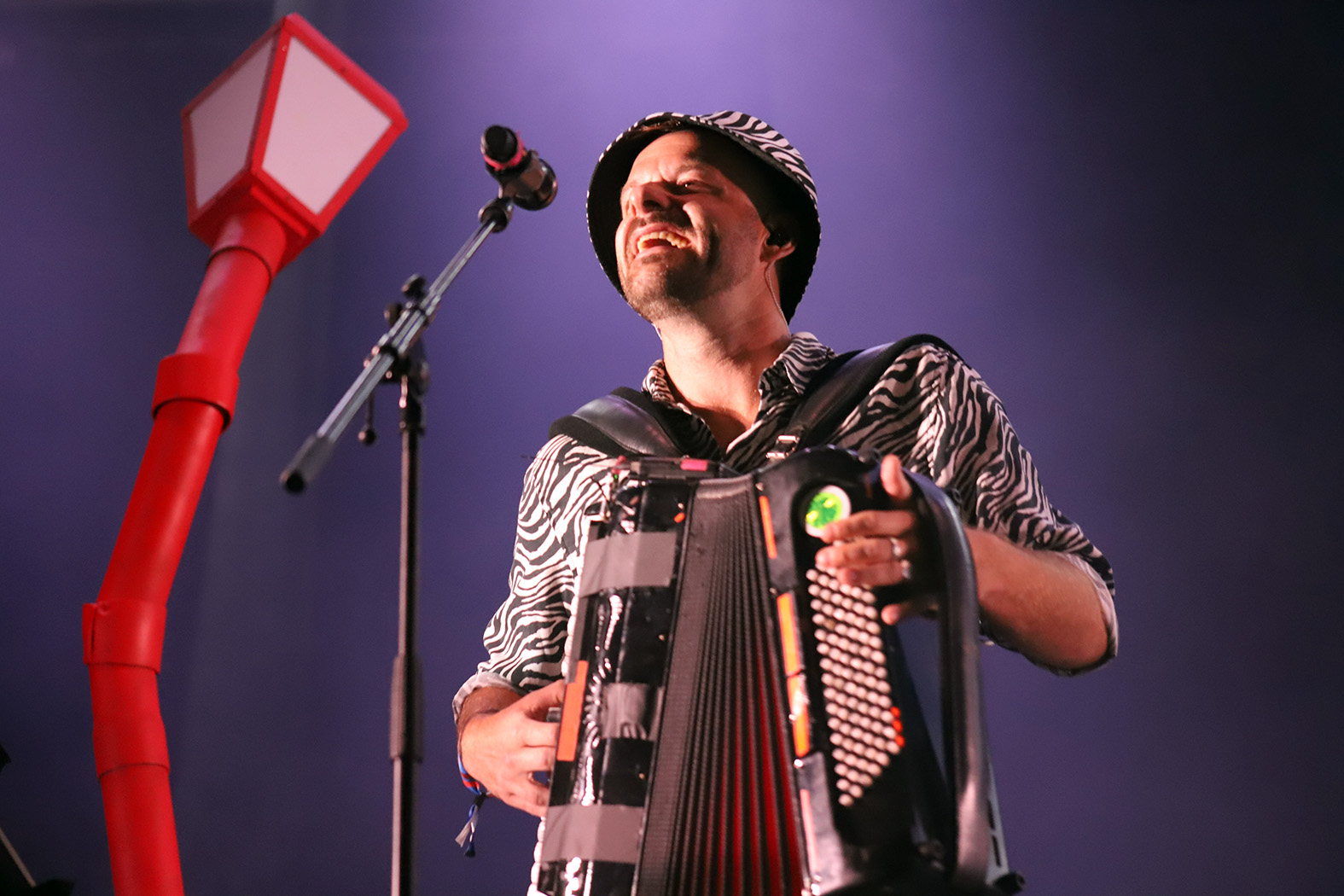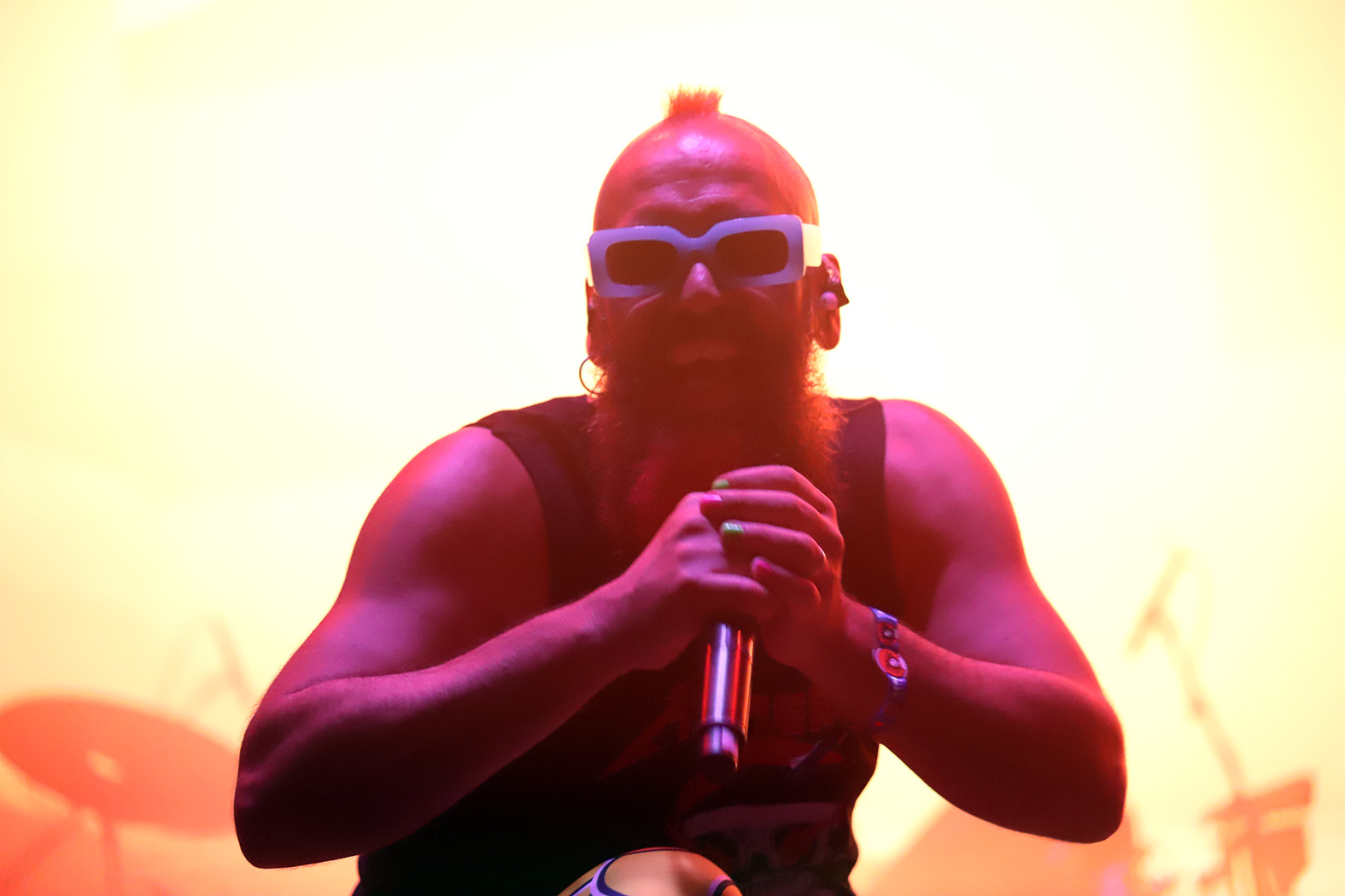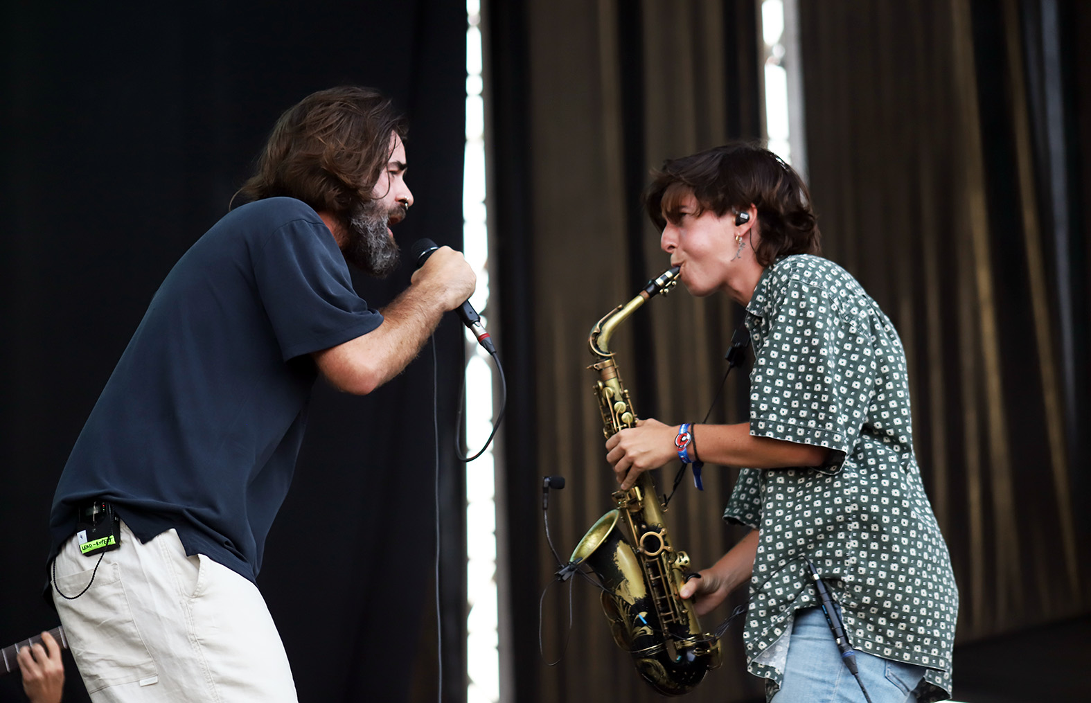 Si el año pasado el cénit de público en la fiesta de bienvenida lo alcanzó SFDK (más que Reincidentes, incluso), en esta edición estaba claro que lo haría La Pegatina, otra banda que repetía visita tras cinco o seis ediciones. Lo hicieron con ese halo de “posible última vez” que deja cualquier gira de parón indefinido y aunque el repertorio no es que haya tenido demasiadas concesiones a bajar el ritmo se hizo más patente si cabe que el soniquete festivo iba a ser una constante. Con una escenografía propia sin grandes alardes pero sí muy currada, tanto en pantallas como en atrezzo y los sempiternos papelillos y serpentinas la colorista música de La Pegatina empezó con “Y Volar” o “Non è Facile” para sacar pronto a relucir la decena de referencias a otras bandas que se cuelan a lo largo de toda la actuación, desde “La Guitarra” de los Auténticos Decadentes”, pasando por el remix rumbero capitaneado por el “Ni Más, Ni Menos De Los Chichos”. Fue poco después de “Candela” y “¿Cómo Explicarte?” cuando Adrià Salas salió al paso de algunos gritos entre el público. «¡Eh! No vengáis a jodernos la fiesta a decir cosas que yo no he dicho. ¡Viva Palestina libre!», apuntó al paso de las críticas que la banda ha recibido siempre por actuar en la fiesta de Eurovisión en Israel hace unos años. Con más guiños y más soniquete ska-rumba todavía quedaría más guiños (“Yo quiero bailar”, “La Mordidita” y un largo etcétera) sin olvidar su remix “Miranda”, “No Som D’Aquí”, “Mari Carmen” y “Lloverá y Yo Veré”.