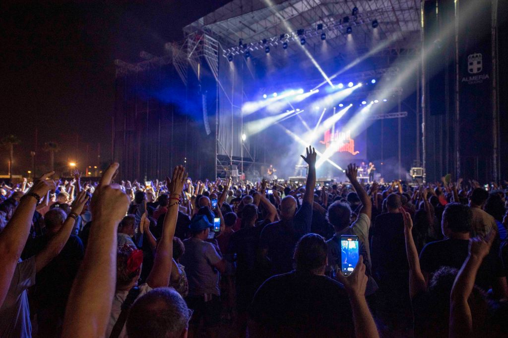 “Necesito respirar” o “Todo tiene su fin” de Medina Azahara. “Molinos de viento” o “Fiesta pagana” de Mägo de Oz. “Prepárate” o “Vamos muy bien” de Obús. Todas infalibles. El Recinto de Conciertos del Ferial recibió anoche la noche con las guitarras y voces más afiladas de la presente Feria de Almería con Maldito Rock. Una denominación que espera tener vocación de continuidad y que contó con la presencia de tres tótems incontestables como, por orden de intervención, Medina Azahara, Mägo de Oz y Obús. Todo ello bajo la producción de DGB Producciones y dentro de la programación especial puesta en marcha desde el Área de Cultura, Tradiciones y Fiestas Mayores del Ayuntamiento de Almería.