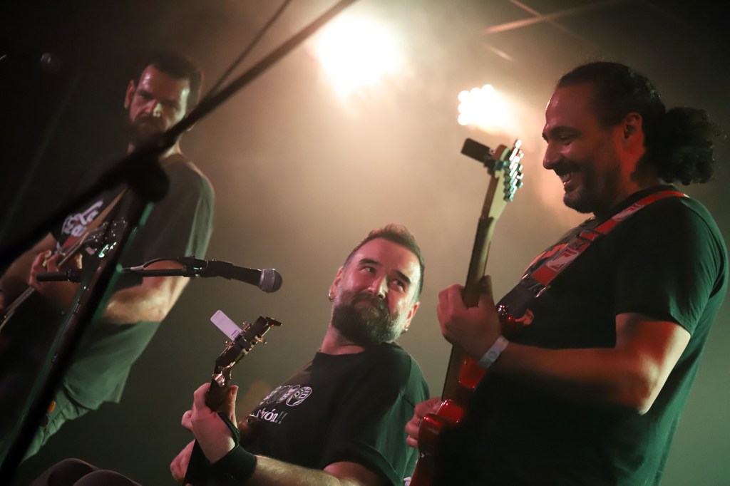 Pero tal y como lo vi, teniendo en cuenta que Juantxu y Jesús son el 50% de Platero y que Fran tiene a favor que el público canta absolutamente todo, a veces al mismo nivel sonoro, el gran papelón considero que lo tiene Txema, que tiene que bregar con la función guitarrera de Iñaki. Y aunque es cierto que ayuda que en el repertorio no se incluyan ‘las más heavies’ de Platero (“Lo Que Os Merecéis”, “Desertor”, “La Maté Porque Era Mía”, “Meando En La Pared”, “Tenemos Que Entrar”…) salió victorioso y ovacionado de retos como los solos concatenados de “Voy A Acabar Borracho” (que fue la siguiente) o la postrera y bluesera “Cantalojas”. Sombrerazo para él.