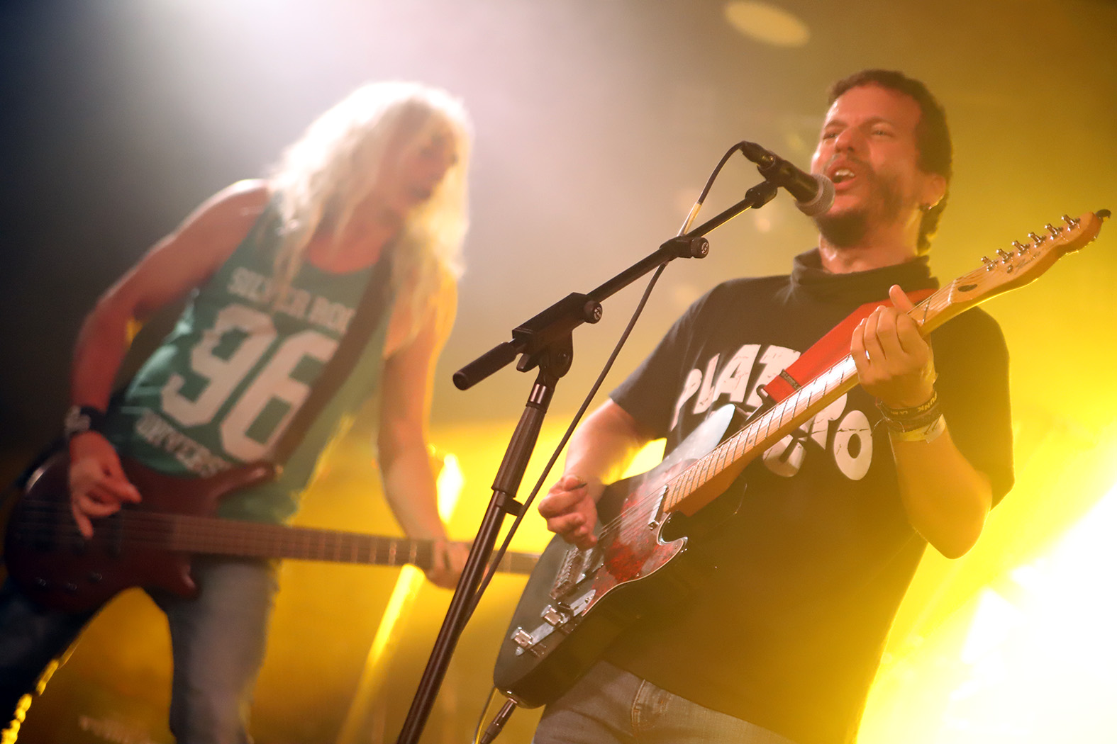 Pero tal y como lo vi, teniendo en cuenta que Juantxu y Jesús son el 50% de Platero y que Fran tiene a favor que el público canta absolutamente todo, a veces al mismo nivel sonoro, el gran papelón considero que lo tiene Txema, que tiene que bregar con la función guitarrera de Iñaki. Y aunque es cierto que ayuda que en el repertorio no se incluyan ‘las más heavies’ de Platero (“Lo Que Os Merecéis”, “Desertor”, “La Maté Porque Era Mía”, “Meando En La Pared”, “Tenemos Que Entrar”…) salió victorioso y ovacionado de retos como los solos concatenados de “Voy A Acabar Borracho” (que fue la siguiente) o la postrera y bluesera “Cantalojas”. Sombrerazo para él.