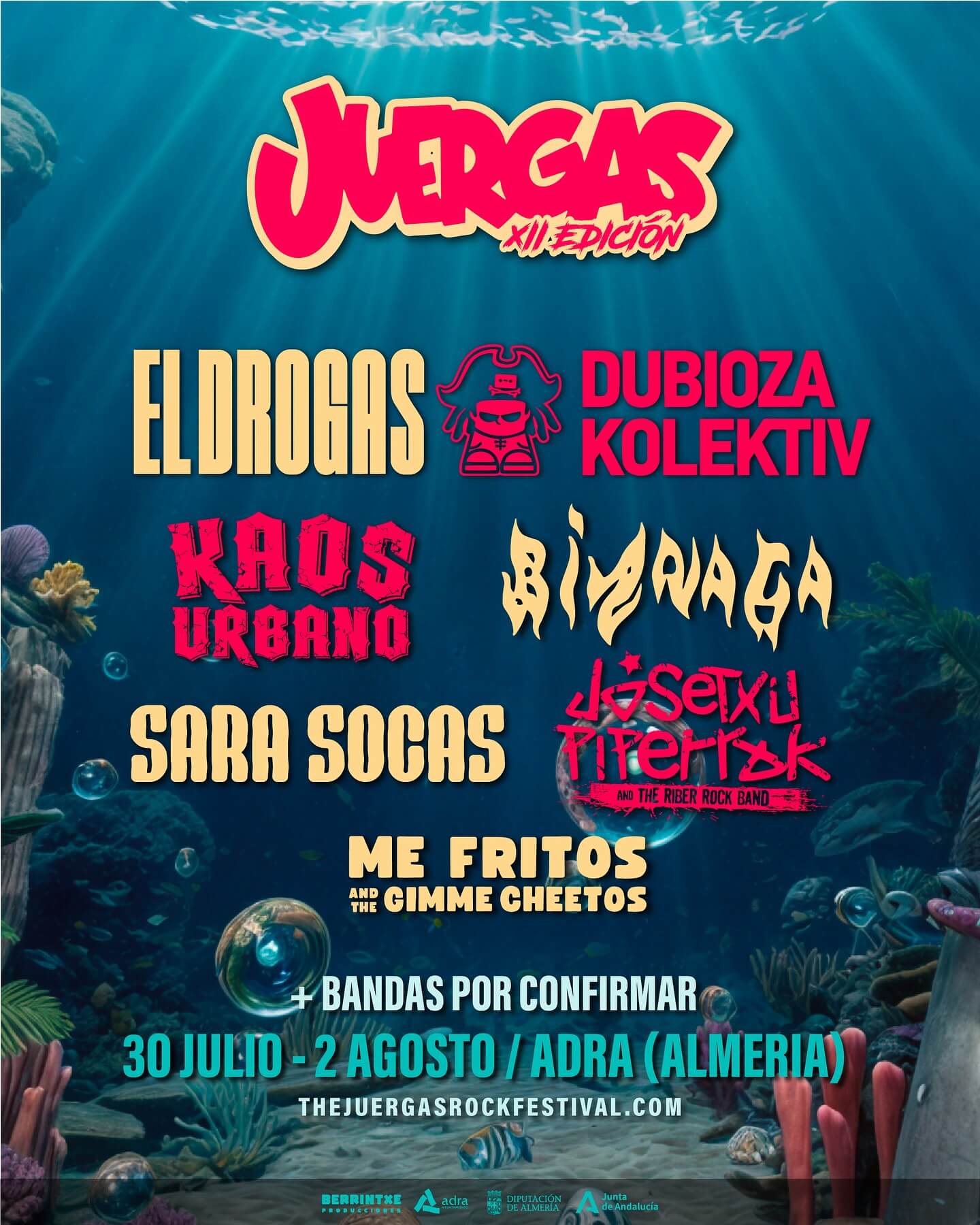 Esta vez sin venta previa de ‘abonos ciegos’, hoy ha llegado al fin la primera tanda de confirmaciones para la próxima edición de The Juergas Rock Festival, que será del miércoles, 30 de julio, al sábado, 2 de agosto. En concreto, las bandas ya confirmadas para la juerga del verano en Adra son: El Drogas, Dubioza Kolektiv, Kaos Urbano, Biznaga (gran acierto el romper ‘la barrera’ que rodea a algunas bandas que están presentes en festivales ‘indies’ pero con una esencia mucho punk-rockera, como es el caso, además con inquebrantable compromiso), Sara Socas, Josetxu Piperrak y Me Fritos and The Gimme Cheetos. RockSesión volverá a estar un año más cubriendo un festival que hemos tenido la suerte de ver crecer cada año, en el que incluso hemos trabajado durante un par de ediciones haciendo entrevistas con público. Como es tradición también, os dejo una playlist recomendada para ir calentando el ambiente de aquí a agosto, que iremos actualizando al paso de las nuevas confirmaciones. Está organizada con una canción por banda en el primer bloque y, a continuación, bloques de cuatro temas de cada una de ellas. Una bonita rutina que tiene ya una amplia legión de adeptos. La mecha de la cuenta atrás ya está prendida y, aunque el camino será largo, la relatividad del tiempo hará que ‘en nada’ nos veamos de nuevo en Adra. Salud. (Os dejo en la entrada todo lo publicado del Juergas a lo largo de los años).