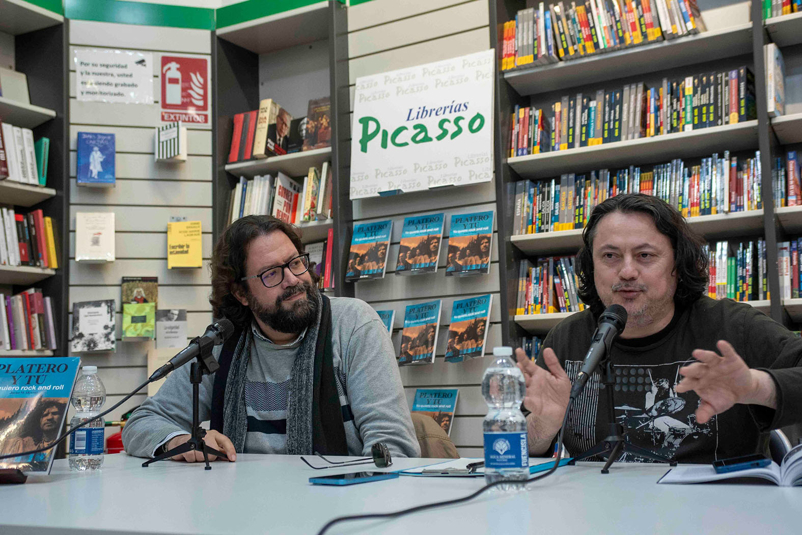 En la presentación estuvo acompañado por otra gran cara reconocible de la escena rockera almeriense como es Iván González, director musical de Sí F.M. y durante muchos años presentador de programas de videoclips en televisión. Iván y Javier mantuvieron una divertida charla, que concluyó con una extensa ronda de preguntas del público, repasando algunos de los hitos principales de la historia de Platero y Tú, que en el libro se recrea con los testimonios exclusivos de sus cuatro protagonistas: Fito Cabrales (guitarra y voz), Iñaki ‘Uoho’ Antón (guitarra, teclados y un largo etcétera), Juantxu Olano (bajo) y Jesús García (batería).