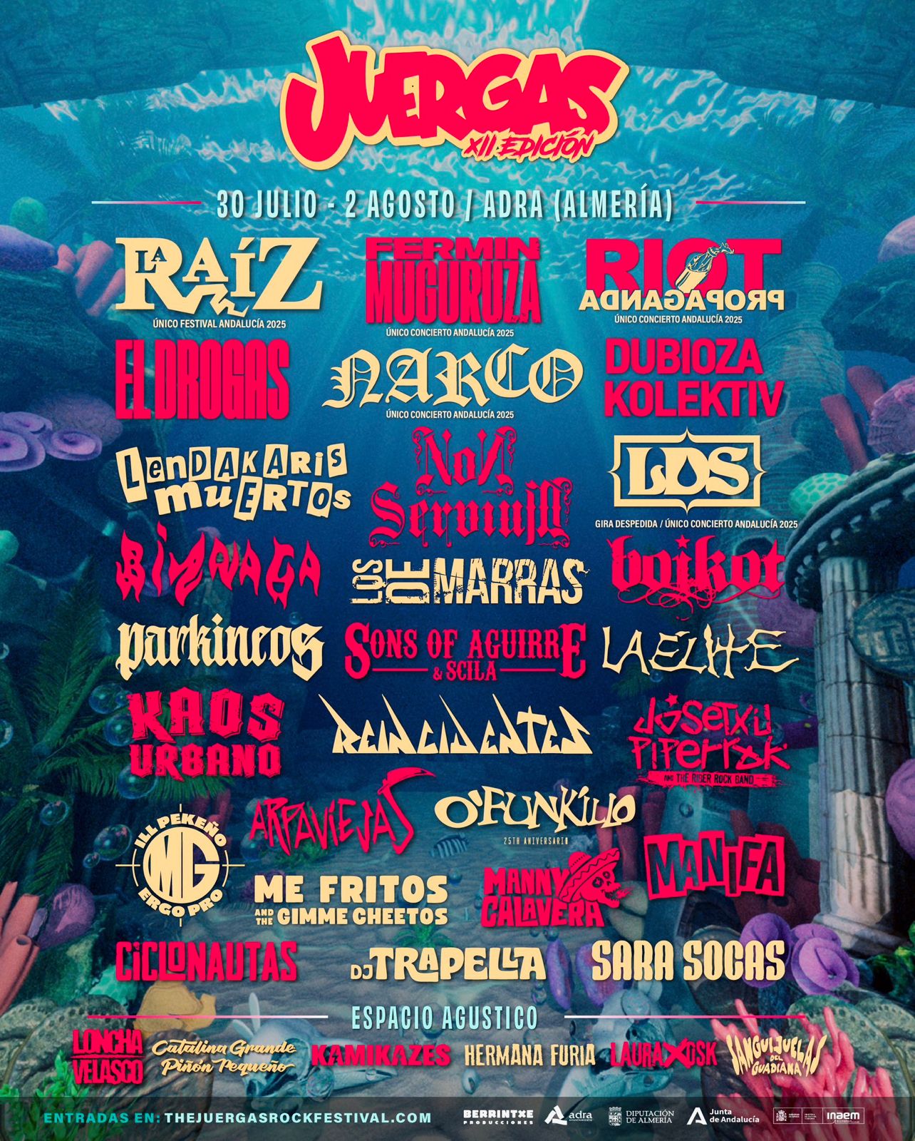 Como suele ser habitual en los últimos años, The Juergas Rock Festival ha vuelto a sorprender a sus seguidores con el anuncio final, de una tacada, de casi la mitad restante que quedaba del cartel. Una remesa en la que encontramos caras conocidas y siempre requeridas por el público festivalero, además de alguna que otra grata sorpresa menos frecuente para festivales de este tipo o, sencillamente, menos asiduos a esta modalidad de evento musical. Las nuevas incorporaciones de esta última ronda han sido: Fermín Muguruza (será su único concierto en Andalucía en 2025), Lendakaris Muertos, Lágrimas De Sangre (gira de despedida y único en Andalucía), Boikot, Ciclonautas, Parkineos, Sons of Aguirre & Scila, Arpaviejas, O’Funk’Illo, Manifa, Manny Calavera, DJ Trapella y para el Espacio Agustico, Loncha Velasco, Kamikazes, Hermana Furia y Sanguijuelas del Guadiana. Se suma a todo lo bueno que ya había, otras 17 bandas. Todo ello, del 30 de julio al 2 de agosto en Adra (Almería).