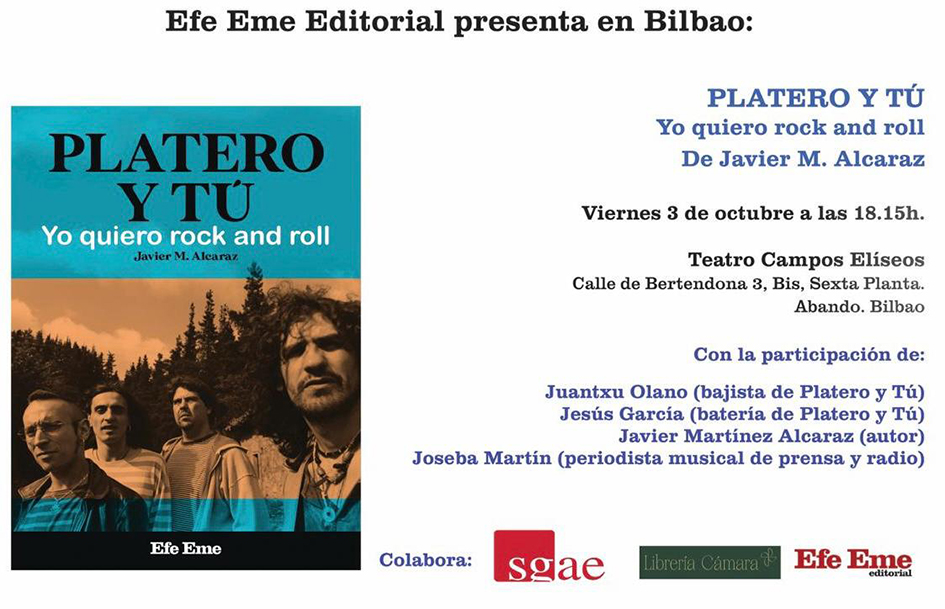 Del mismo modo que quise ‘cerrar el círculo’ de las presentaciones de libro de Extrechinato y Tú en Plasencia (cuna de Robe) y en Chinato’s Bar (el bar de Manolo Chinato en Puerto de Béjar), después de publicarlo el pasado mes de enero, mi firme deseo era conseguir una presentación final del libro de Platero y Tú en su cuidad, en su Bilbao natal. Después de realizar presentaciones en Almería, Plasencia, Puerto de Béjar y dos en Madrid, era lo correcto y por fin hoy lo puedo hacer oficial. Platero y Tú. Yo quiero rock and roll se presentará el próximo viernes, 3 de octubre, en la sexta planta del Teatro Campos Eliseos, gracias a la colaboración de SGAE, su Fundación y Librería Cámara. Además, tengo el placer de anunciar que en la cita me acompañarán, nada más y nada menos, que Juantxu Olano y Jesús García, bajista y batería de Platero y Tú. La charla la moderará el periodista musical de prensa y radio Joseba Martín y al término de la conversación informal habrá, claro está, firma de ejemplares para todas las personas que quieran acompañarnos. El inicio está previsto para las 18.15 horas y esperamos terminar para antes de las 20.00 horas. Sobre la posible presencia/ausencia de Fito e Iñaki, se les ha invitado y hay que ser honestos, como siempre: Fito anda haciendo entrevistas para la promoción de su nuevo disco, El Monte De Los Aullidos, que sale el 24 de octubre, e Iñaki anda apartado de la vida pública por lo que, aunque la puerta está abierta hasta si quieren presentarse por sorpresa, es bastante improbable. Sea como sea, será un placer celebrar el recuerdo de una banda siempre tan querida y añorada, como habéis demostrado haciendo que ya estemos por la segunda edición. ¡Nos vemos el 3 de octubre!