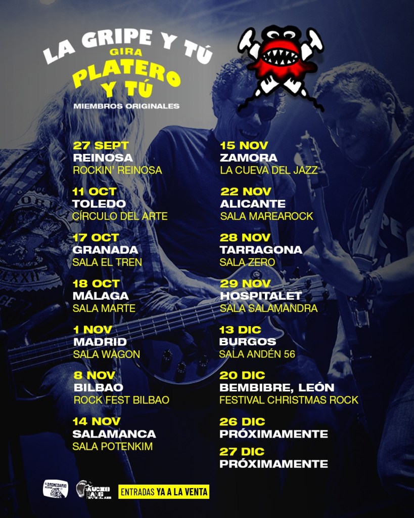 Los días 28 de febrero y 2 de marzo del presente año La Gripe y Tú, con sendas ‘entradas agotadas’, hizo escala en el Kafe Antzokia de Bilbao en el marco de la gira con la que La Gripe (Juantxu Olano, Jesús García y Txema Sedientos), acompañados por Fran Malanoche, están reviviendo el legado de Platero y Tú, con la autenticidad que da tener a dos de sus cuatro músicos originales. Dos veladas que fueron registradas para la posterior edición de un cedé y deuvedé en directo del que llega hoy mismo el primero de sus adelantos. Todo un tótem de la discografía de Platero como es “Alucinante”, canción que formaba parte de 7, publicado en 1997. Fue el primero de estudio tras el mítico A Pelo en directo. El estreno coincide mágicamente en la misma semana en la que os he anunciado que el próximo viernes, 3 de octubre, estaré en Bilbao, con Juantxu y Jesús, presentando mi libro Platero y Tú. Yo quiero rock and roll, que va ya por su segunda edición. Para más casualidades, tras la presentación y firma de ejemplares del libro (Librería Cámara estará allí en la sala para atenderos, si no lo tenéis ya) marcharemos precisamente al Kafe Antzokia donde se grabaron los conciertos para disfrutar de la gira conjunta de Ciclonautas y Malaputa, con ‘los Marea’ Alen Ayerdi y El Piñas y Kolibrí, respectivamente, en sus filas. Una cuadratura de círculo completamente “Alucinante”. Play y a disfrutarlo. ¡Nos vemos el 3 de octubre!