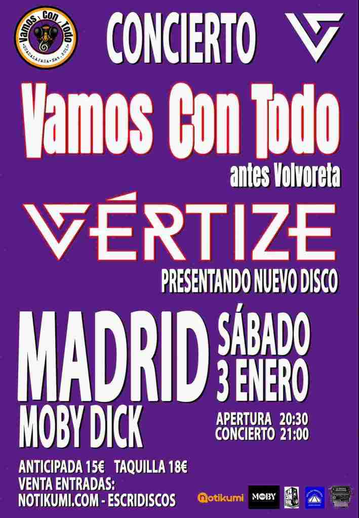 Una vez publicados todos los temas del disco Delta de Vértize, del que os traje crítica aquí hace unas pocas semanas, quedaba por publicar como single y videoclip el tema “Punto De Colisión” con la colaboración de Poncho K y como bonustrack, que solo aparece en la edición exclusiva en vinilo del álbum. Tras estrenarse ayer en audio con los compañeros de El Vuelo del Fénix, hoy hacemos lo propio, un día antes, con el videoclip. Esta grabación es inédita y solo estará disponible en la edición vinilo de Delta el nuevo y primer álbum de Vértize, producido por Iñaki “Uoho” Antón (Platero y Tú, Extremoduro, Extrechinato y Tú, Rebrote…). Esta nueva edición de “Punto De Colisión” de Vértize con Poncho K, la grabaron en el reconocido Estudio Uno de Madrid, el mismo estudio donde han registrado sus últimos discos artistas como Robe, Tarque, Leiva o Fito & Fitipaldis como se puede apreciar en el videoclip. Vértize se encuentra en plena de gira y su próximo concierto-presentación en Madrid será, junto al grupo Vamos Con Todo (antes Volvoreta), el próximo sábado, 3 de enero, en la madrileña sala Moby Dick. ¡Eso sí que es empezar el año con buen pie! Os dejo el videoclip.