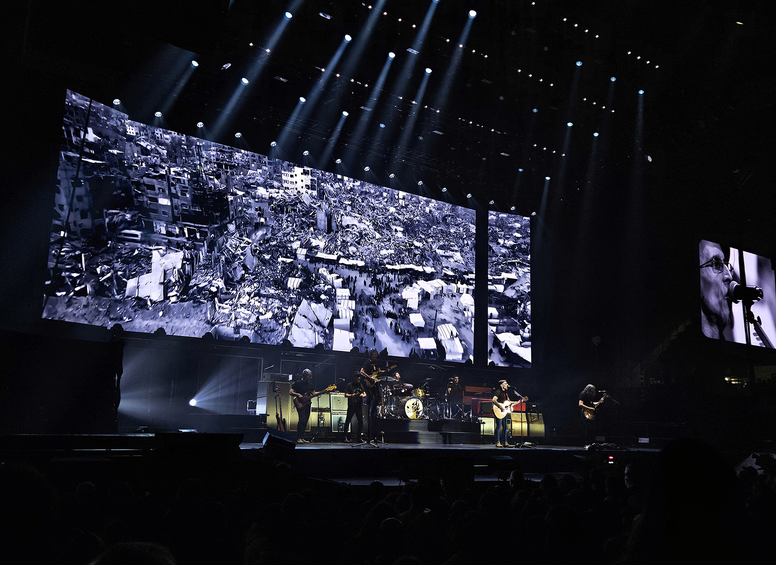 Volviendo a los sonidos más furiosos y rugosos entró en el momento correcto “A Quemarropa”. “El Monte De Los Aullidos” y “Volverá El Espanto” fueron momentos de recogimiento emocional. El primero desde la perspectiva interior y el segundo con un explícito y doliente mensaje de dolor con imágenes de Gaza arrasada, bien grandes en la pantalla gigante para que hasta los que no quieren verlo sean conscientes de lo que ha pasado –y sigue pasando-. O lo que es lo mismo, a veces no son necesarias las palabras o proclamas para trasladar mensaje, compromiso, emoción. Ya sea en este caso como en esas críticas que se pueden leer porque el día que Robe voló solo publicó un corazón negro y escuetas palabras. Hay casos en los que no es necesario decir más y –dado que me preguntáis por activa y por pasiva por el tema- no creo que Fito tenga que rendir cuentas sobre su dolor o su amor por una persona que, como ha confesado tantas veces, le cambió la forma de escribir una canción para siempre como le cantó ya en ese «Las Nubes De Tu Pelo» que regaló en Pamplona dos días después. Fin de este tema.