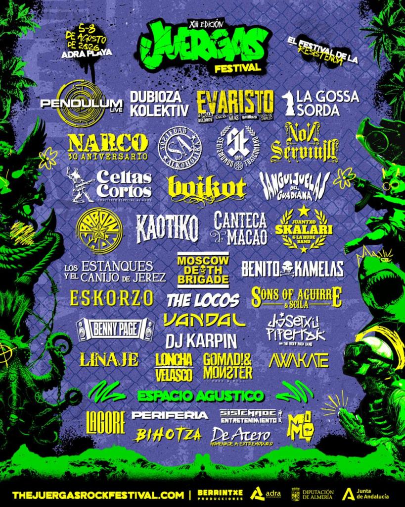 El emblemático festival de punk rock almeriense desvela lo que será la decimotercera edición al completo, que tendrá lugar del 5 al 8 de agosto en la ciudad de Adra. El cartel de The Juergas Rock Festival, que ya añadió por sorpresa y como ‘verso suelto’ hace unas semanas a La Gossa Sorda, suma seis nuevas confirmaciones en su espacio de conciertos gratuitos diurnos conocido como “Agustico”. La Gore, Periferia, Momo, Sistema de Entretenimiento, Bihotza, De Acero (homenaje a Extremoduro) harán que el paseo Marítimo de Adra vibre en las horas del medio día. Con esta apuesta, el festival no solo refuerza su oferta musical, sino que también impulsa a artistas emergentes. Además el festival cuenta con 34 artistas que pondrán la banda sonora a la indiscutible Además el festival cuenta con 34 artistas que pondrán la banda sonora a la indiscutible juerga del verano, liderado por grupos como Pendulum LIVE, único concierto en el sur de la península, Dubioza Kolektiv, Evaristo, La Gossa Sorda o Narco. Junto a ellos, destacan grandes artistas consolidados en la escena como Segismundo Toxicómano, Soziedad Alkoholika, Juantxo Skalari, Eskorzo y Canteca de Macao que se suman a Kaotiko, Josetxu Piperrak y The Baboon Show. Además, abren espacio a las nuevas generaciones del punk y el rock, incorporando a Sanguijuelas del Guadiana, Linaje y Awakate, tres nombres que están pisando fuerte en la escena actual.