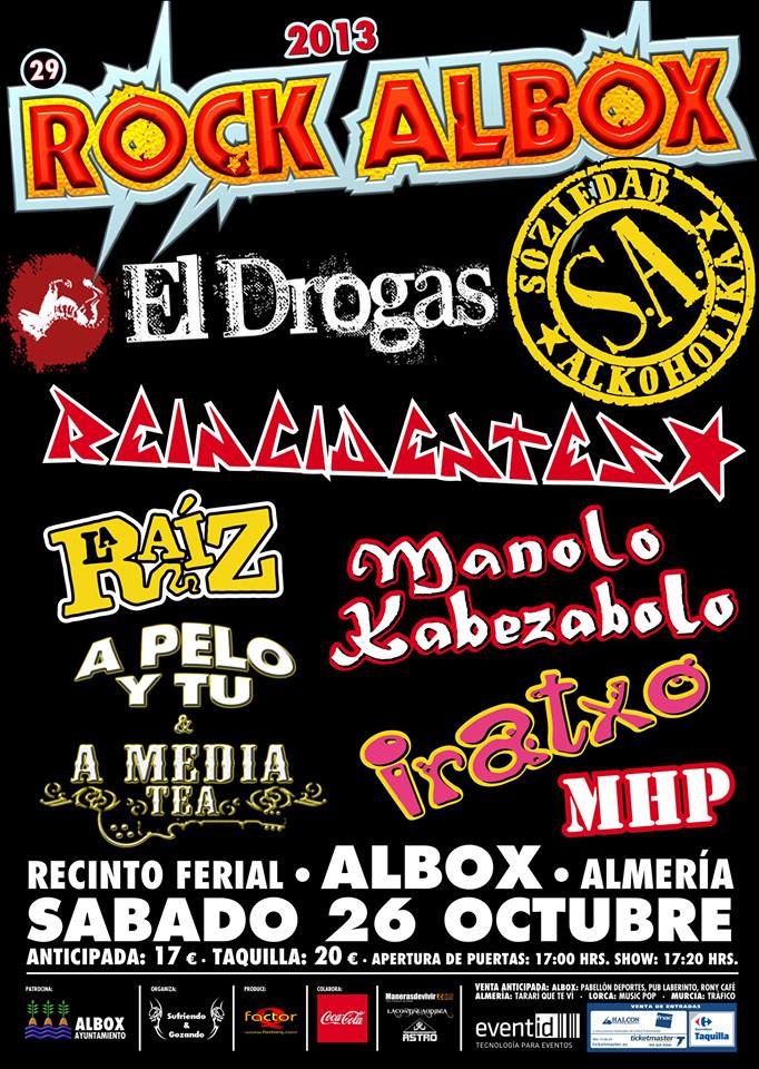 A falta de poco más de quince días os presentamos la playlist con los grupos integrantes del festival Rock Albox, que cumple su 29º edición el 26 de octubre, la segunda desde que Sufriendo y Gozando y Factor Q (Aúpa Lumbreiras, Leyendas Del Rock) se hicieran cargo del mismo. El cartel es toda una garantía de éxito con la veteranía de El Drogas (no sabemos si adelantará algún tema de Demasiados Tontos En La Corteza, su próximo disco), Reincidentes (a punto de lanzar su Aniversario), Soziedad Alkohólika con Caucho Ardiendo o Manolo Kabezabolo, uno de los frontman más carismáticos del punk nacional. Además habrá grupos que, en plena trayectoria ascendente, como La Raíz e Iratxo, harán bailar al respetable, junto a los rockeros A Media Tea / A Pelo y Tú, que se presentan en su doble vertiente, y los almerienses MHP. Ingredientes no faltan para una velada perfecta.