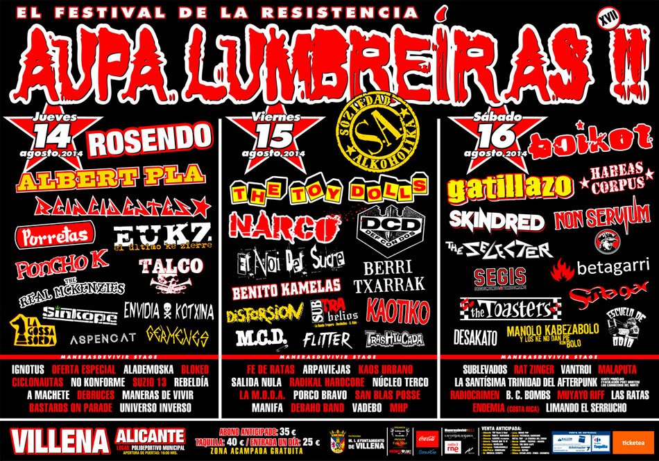 Con varias semanas más tarde de lo que suele ser habitual y con un cartel en el que se prescindió de los grandes nombres habituales (Soziedad Alkohólika, Boikot, Narco, EUKZ…), la fiesta de presentación del Aúpa Lumbreiras de este año se anunció cuando casi todos pensaban que ni habría y con una intención clara, pequeñas grandes bandas y una reducción de aforo al cerrar las gradas de la plaza de toros de Villena. Doce grupos de buen nivel para la crítica y que, en muchos casos, llegaban a la cita con discos recién estrenados o a puntito. Es el caso de Desakato, Porco Bravo, Envidia Kotxina (en unos días), Rat-Zinger, Manolo Kabezabolo (en mayo), Suzio 13, Kaos Urbano… A ellos se sumaron los locales Banda Jachís y Alademoska, Vagos Permanentes, Línea 36 y Pan De Higo. Por doce euros, doce bandas. Y con sobrados argumentos para que compensara de todas, todas. La gente se queja de que siempre van los mismos… Y lo que pasó es que apenas se llegó a la mitad del aforo (1.650). Nosotros estuvimos allí y esto es lo que pasó… o más bien, lo que vivimos.