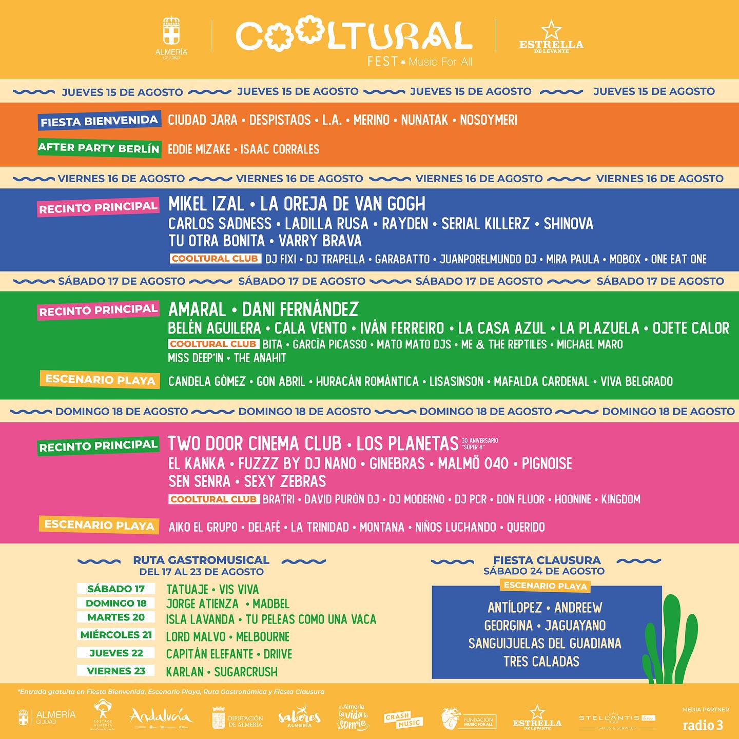 Más de 80 bandas, tres escenarios en el recinto principal, otro al lado de la playa con dos jornadas en los días principales y otra final de la clausura a la semana siguiente, ruta gastromusical en pleno centro de la ciudad… y un recinto de conciertos a estrenar que más que duplica su superficie con respecto al año anterior (ya de por sí duplicada con respecto a la primera edición de 2018) y otro aumento significativo en las medidas inclusivas que, más de 80, aplica la Fundación Music For All. La historia de Cooltural Fest, de la que tengo el placer de formar parte desde su primera edición, es la de la mejora constante, la del paso a paso… pero siempre hacia más. Una cita que ‘me exige’ un brutal esfuerzo porque además me coge en plena cobertura del resto de actividades de las fiestas patronales de la ciudad de Almería y, para colmo, este año con la recta final de lo que será mi segundo libro que ofrecer al mundo, después del bien recibido y bien agradecido Extrechinato y Tú ensancha el alma. Dejo por aquí los horarios, como boya de seguridad, que vienen días complicados. Después de estas sesiones maratonianas que tengo que ‘croniquear’ al día siguiente en cada caso (cuando no el mismo día en los conciertos diurnos), seguiremos con el 17º Happy Moy Festival (Comic Sans, Horizon, Loudly, Monogay, Dicrotic) el 21 de agosto y con Maldito Rock (Medina Azahara, Obús, Mägo de Oz) el día 22. Vivir para contarlo. Os dejo los horarios e información extendida. Salud.
